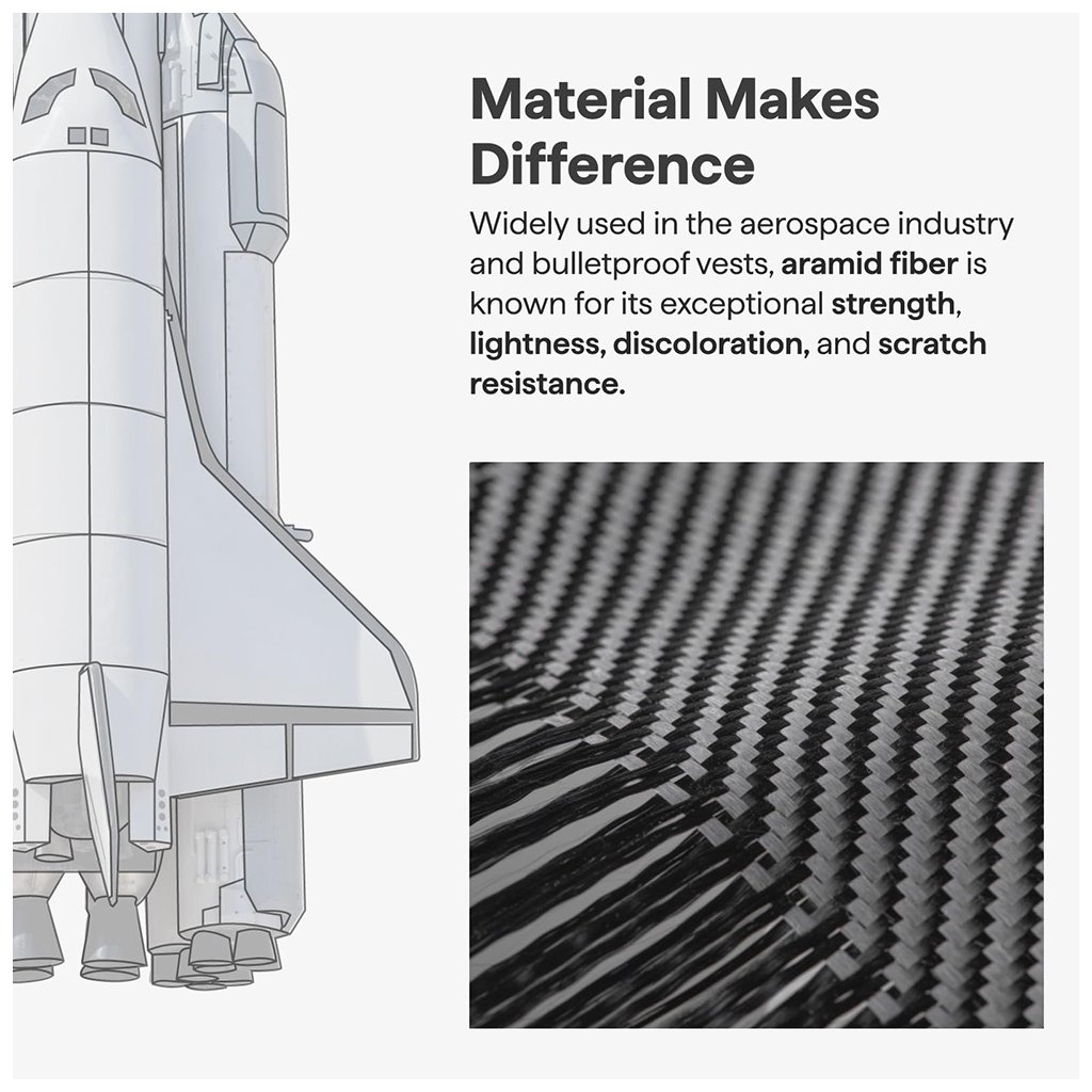 - Kryt je vyrobený z aramidových vlákien, materiálu známeho pre svoju extrémnu pevnosť a ľahkosť, ktorý sa často využíva v leteckom priemysle alebo balistickej ochrane.