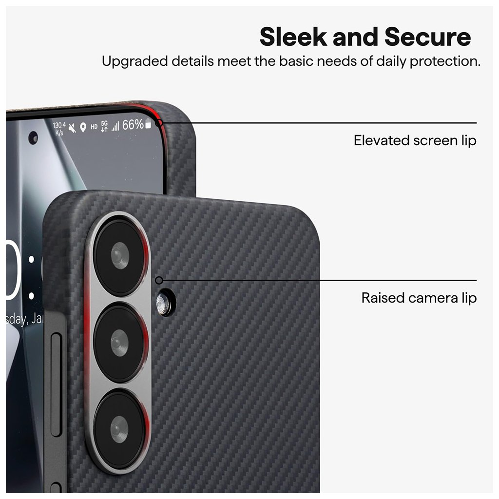 Puzdro Techsuit Aramid Fiber sa pýši minimalistickým a zároveň sofistikovaným vzhľadom. Je vyrobené z aramidových vlákien, materiálu známeho pre svoju výnimočnú pevnosť, ľahkosť a odolnosť proti poškriabaniu a zmene farby, ktorý sa hojne využíva aj v leteckom priemysle a nepriestrelných vestách. Charakteristická jemná textúra aramidových vlákien dodáva puzdru moderný "carbon fiber" vzhľad a zaisťuje príjemný a istý úchop.