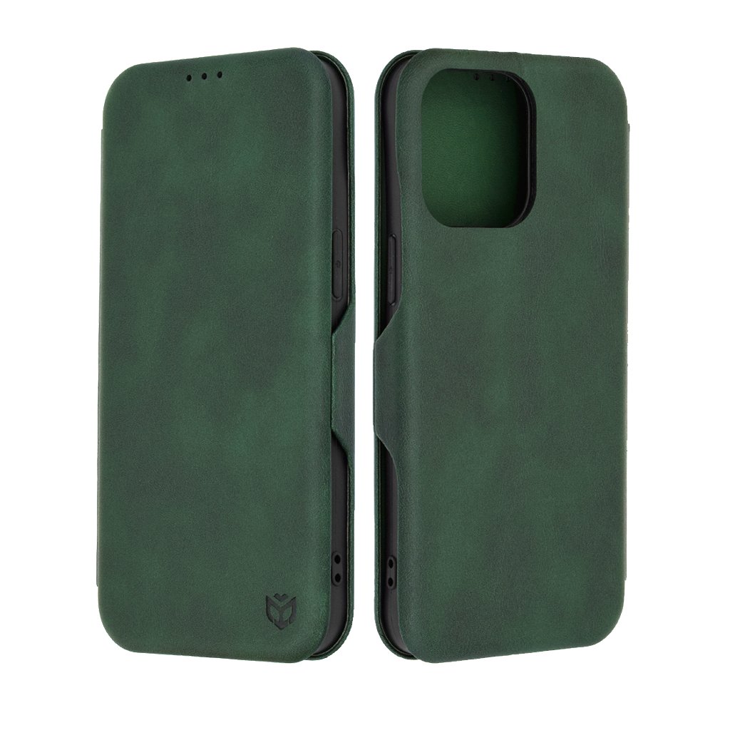 Puzdro Techsuit Bezpečná Peňaženka Plus sa pýši sofistikovaným folio dizajnom v sýto zelenej farbe, ktorá dodá vášmu zariadeniu nádych luxusu. Jeho povrch má jemnú textúru s matným finišom, pripomínajúcu kvalitnú kožu, čo zaisťuje príjemný pocit na dotyk a zároveň minimalizuje odtlačky prstov. Na prednej strane diskrétne vyniká logo Techsuit, symbol kvality a precíznosti. Puzdro dokonale obopína telefón a poskytuje ochranu zo všetkých strán, vrátane displeja vďaka prednému odklápaciemu krytu. Samozrejmosťou sú presné výrezy pre fotoaparát, reproduktory, mikrofóny a nabíjací port, rovnako ako citlivé tlačidlá pre bezproblémové ovládanie. Na prednej chlopni sú navyše tri malé perforácie pre slúchadlo, umožňujúce hovory aj so zatvoreným puzdrom.