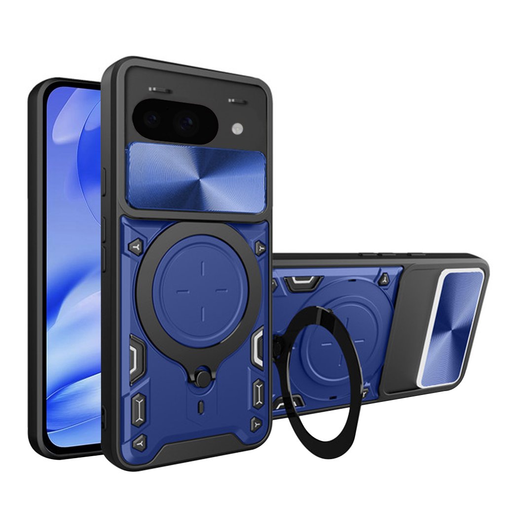 Puzdro Techsuit CamGuard Pro v elegantnej modrej farbe je navrhnuté s dôrazom na maximálnu ochranu a praktickosť. Jeho robustná konštrukcia kombinuje tmavomodré a čierne prvky, ktoré dodávajú telefónu moderný a odolný vzhľad. Zadná strana puzdra disponuje posuvným krytom fotoaparátu s textúrou brúseného kovu, ktorý efektívne chráni šošovky pred poškriabaním a nečistotami. Integrovaný otočný krúžok slúži ako praktický stojan pre sledovanie obsahu alebo ako bezpečné pútko pre držanie telefónu. Puzdro je navrhnuté tak, aby dokonale obopínalo krivky telefónu Google Pixel 9a a poskytovalo spoľahlivú ochranu proti pádom a nárazom, bez toho, aby obmedzovalo prístup k ovládacím prvkom a portom.