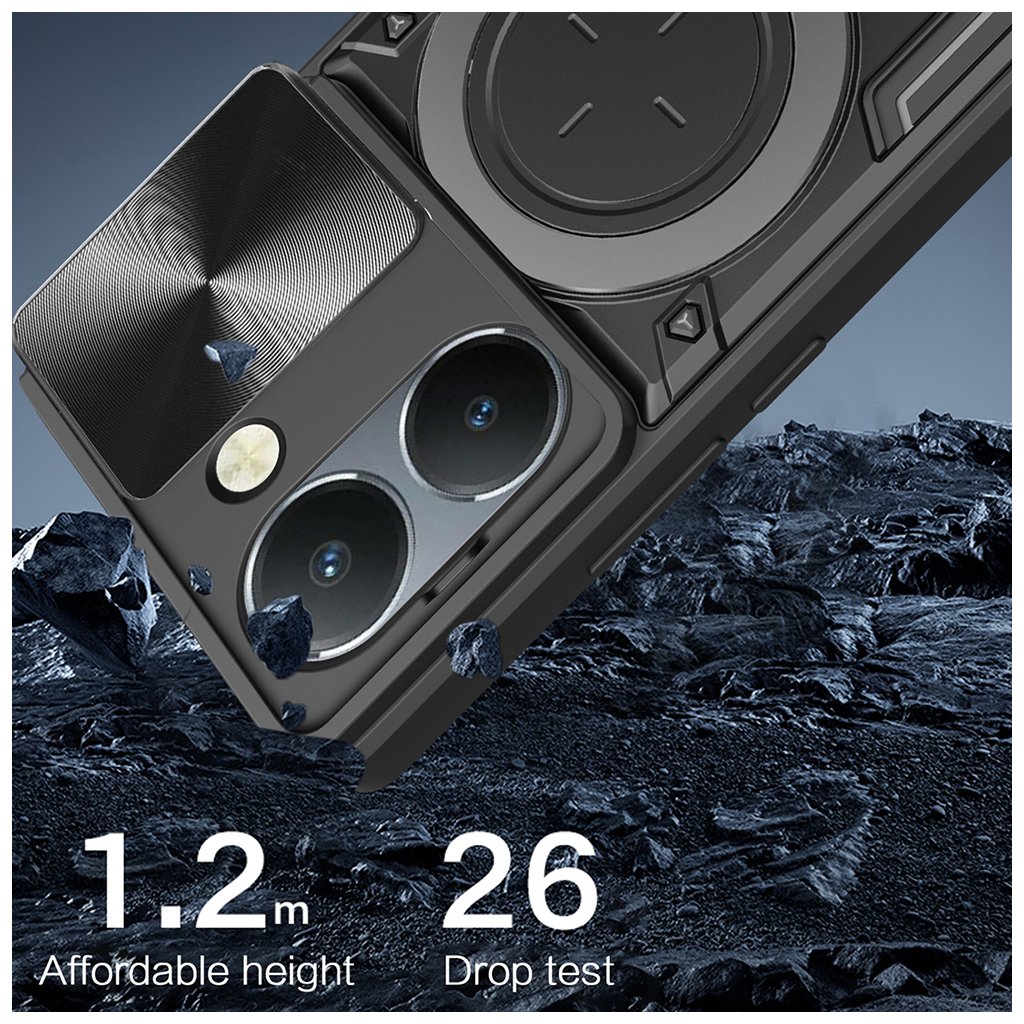 - Dominantným prvkom je integrovaný posuvný kryt fotoaparátu s unikátnym kruhovým textúrovaným vzorom, ktorý spoľahlivo chráni citlivé objektívy pred poškriabaním a nečistotami.