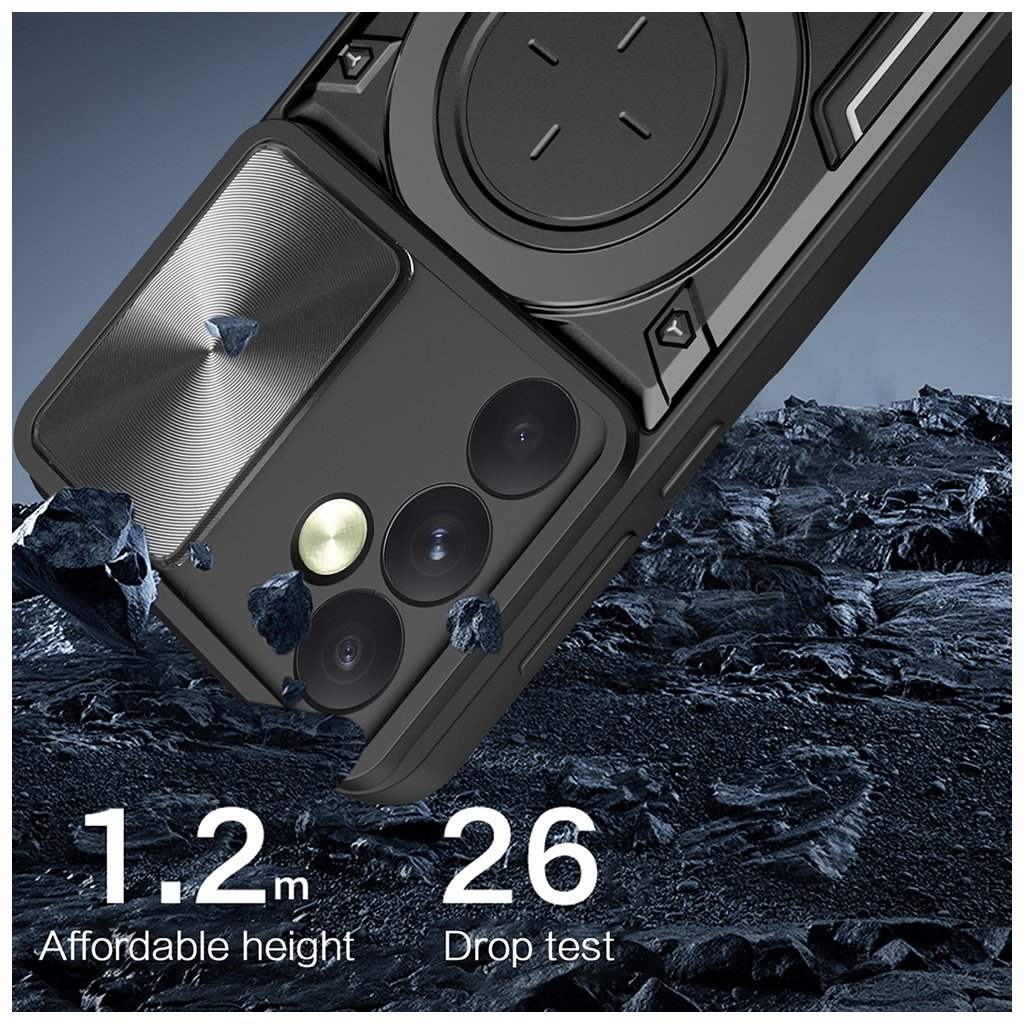 - Efektívna ochrana šošoviek fotoaparátu pred poškriabaním a nečistotami vďaka posuvnému krytu.