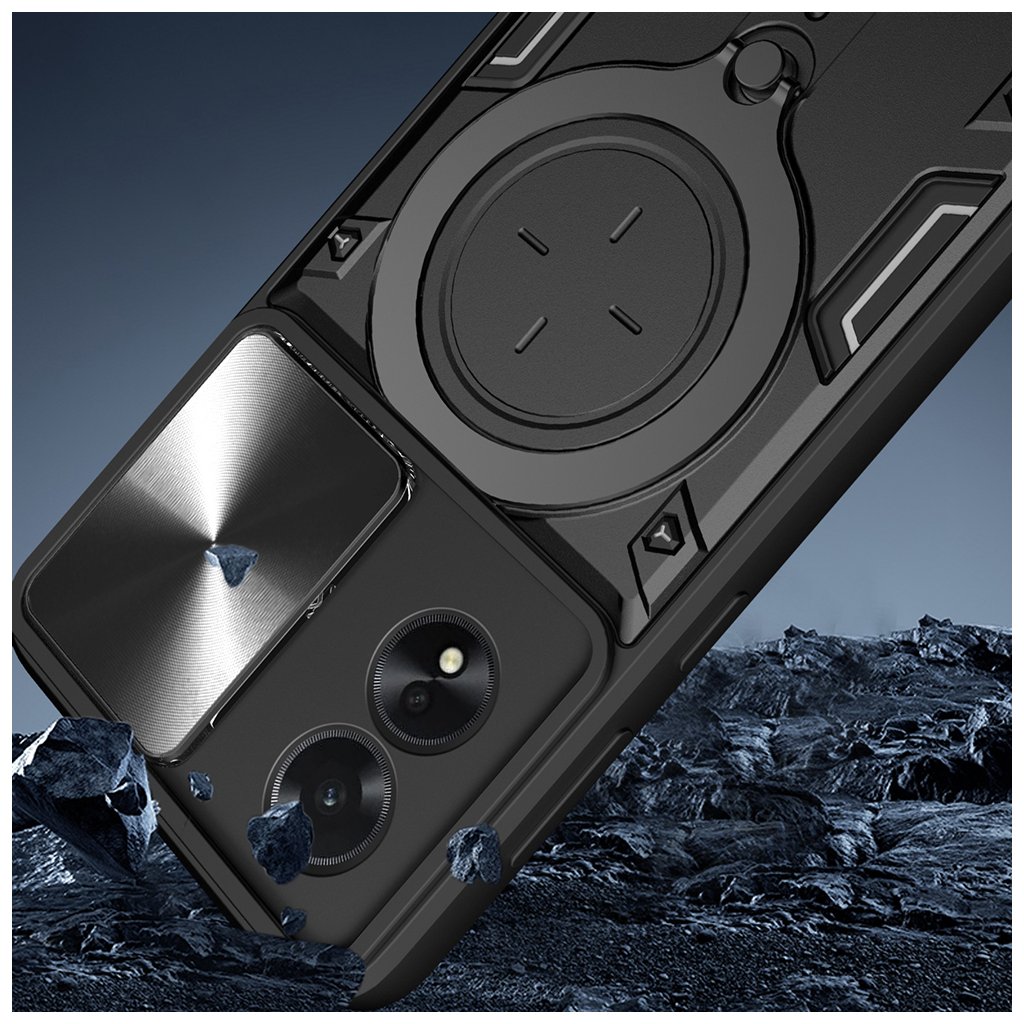 Kryt Techsuit CamGuard Pro v elegantnej červeno-čiernej kombinácii je navrhnutý s dôrazom na maximálnu ochranu a funkčnosť. Jeho robustný a ľahko "obrnený" vzhľad s výraznými líniami a zvýšenými okrajmi poskytuje spoľahlivú ochranu proti nárazom a pádom. Kľúčovým prvkom je integrovaný posuvný kryt fotoaparátu s textúrou brúseného kovu, ktorý efektívne chráni šošovky pred poškriabaním a nečistotami. Na zadnej strane sa nachádza multifunkčný kruhový prvok, ktorý slúži ako magnetický držiak a zároveň ako praktický stojan pre pohodlné sledovanie obsahu. Konštrukcia krytu je viacvrstvová, kombinujúca mäkkú TPU spodnú časť s pevnou PC zadnou doskou a integrovaným železným plátom pre magnetické uchytenie. Zosilnené rohy a hrany ďalej zvyšujú odolnosť proti poškodeniu.