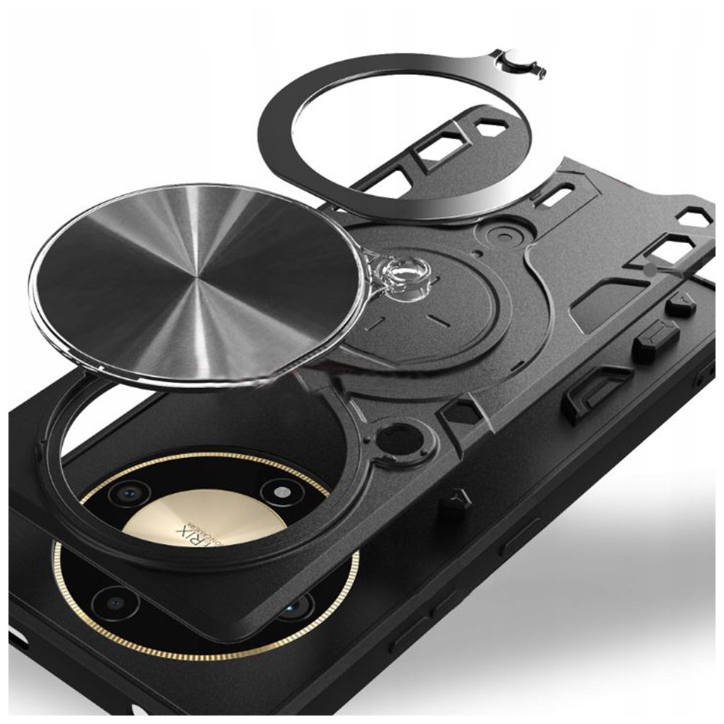 Kryt Techsuit CamGuard Pro v elegantnej čiernej farbe je navrhnutý s ohľadom na maximálnu ochranu a praktickosť. Jeho robustná konštrukcia s vyvýšenými okrajmi efektívne chráni displej aj zadnú stranu telefónu pred poškriabaním a nárazmi. Kľúčovým prvkom je inovatívny posuvný kryt fotoaparátu, ktorý zaisťuje absolútne bezpečie pre citlivé šošovky vášho Honor Magic5 Lite a zároveň chráni vaše súkromie. Integrovaný otočný krúžok na zadnej strane slúži ako praktický stojan pre pohodlné sledovanie obsahu alebo ako bezpečný úchyt pre pevnejšie držanie telefónu. Vďaka precíznemu spracovaniu a textúrovanému povrchu kryt skvele padne do ruky a minimalizuje riziko vykĺznutia.