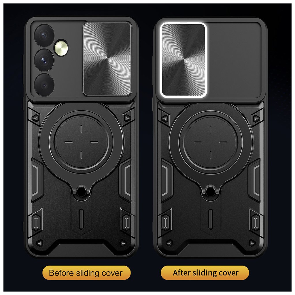 Kryt Techsuit CamGuard Pro sa pýši robustným a zároveň sofistikovaným dizajnom. Jeho čierna farba a textúrované prvky dodávajú telefónu moderný a ľahko taktický vzhľad. Kľúčovým prvkom je integrovaný posuvný kryt fotoaparátu s unikátnym CD vzorom, ktorý efektívne chráni citlivé objektívy vášho Samsung Galaxy A35 5G pred poškriabaním a nárazmi, keď ich nepoužívate.