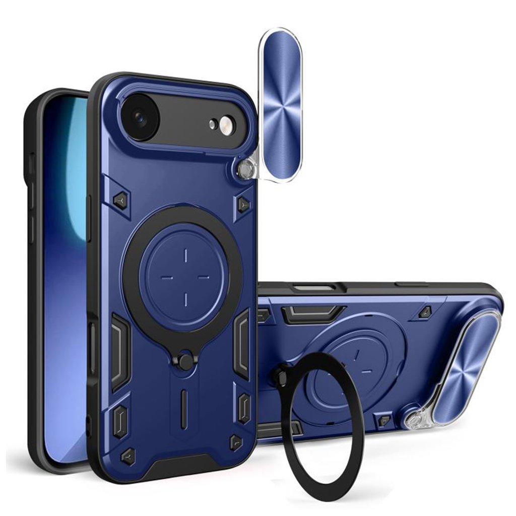 Kryt Techsuit CamGuard Pro sa pýši moderným a odolným dizajnom. Jeho modré prevedenie je doplnené o čierne akcenty, ktoré dodávajú puzdru dynamický a športový vzhľad. Na zadnej strane je výrazný kruhový prvok, ktorý slúži ako integrovaný magnetický držiak a zároveň ako stojanček pre pohodlné sledovanie obsahu. V hornej časti sa nachádza precízny výrez pre fotoaparát, ktorý je navrhnutý tak, aby poskytoval maximálnu ochranu objektívu. Bočné strany krytu sú ergonomicky tvarované pre istý úchop a tlačidlá sú chránené, pričom si zachovávajú príjemnú odozvu. Súčasťou dizajnu je aj vysúvací prvok s kartáčovaným kovovým vzhľadom, ktorý môže slúžiť ako ďalšia opora alebo dizajnový detail.