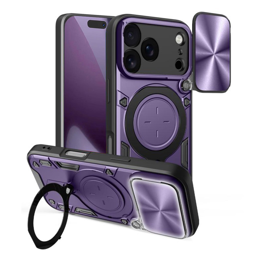 Puzdro Techsuit CamGuard Pro v elegantnej fialovej farbe sa vyznačuje robustným, avšak sofistikovaným dizajnom. Jeho matný povrch príjemne padne do ruky a minimalizuje odtlačky prstov. Kľúčovým prvkom je integrovaná posuvná ochrana fotoaparátu, ktorá spoľahlivo chráni citlivé šošovky pred poškriabaním a nárazmi, keď ich nepoužívate. Tento posuvný kryt má navyše štýlovú textúru brúseného kovu, ktorá dodáva puzdru moderný vzhľad.