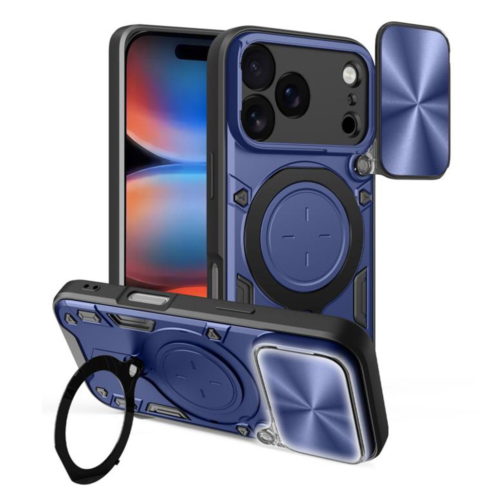 * **Model telefónu:** iPhone 17 Pro Max * **Farba:** Modrá s čiernymi akcentmi * **Materiál:** PC plast, zliatina, TPU * **Funkcie:** * Integrovaná posuvná krytka fotoaparátu * Kovový stojan/prstenec (otočný o 360°, nastaviteľný uhol o 90°) * Silná magnetická priľnavosť pre držiaky do auta * **Ochrana:** Odolnosť proti nárazom a pádom, ochrana objektívov * **Značka:** Techsuit * **Štandardy:** Spĺňa európske štandardy kvality, zdravotne nezávadné materiályDodatočné parametre