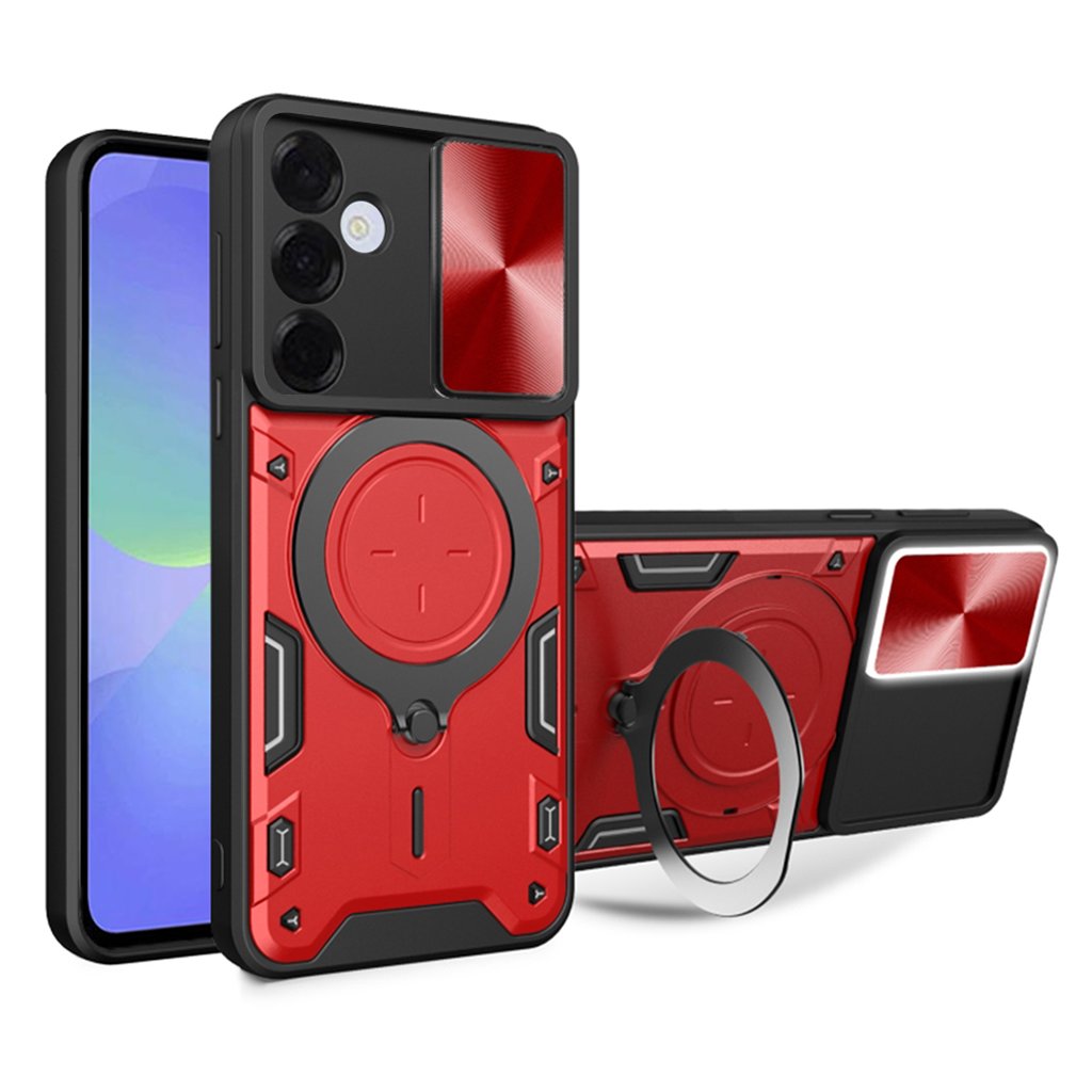 Puzdro Techsuit CamGuard Pro v elegantnej červenej farbe s čiernymi akcentmi je navrhnuté tak, aby poskytovalo maximálnu ochranu a zároveň podčiarklo štýl vášho telefónu. Jeho robustná konštrukcia kombinuje pevné materiály, ktoré efektívne absorbujú nárazy a chránia pred poškriabaním. Dominantným prvkom je integrovaný posuvný kryt fotoaparátu, ktorý chráni šošovky pred poškodením a nečistotami, keď ich nepoužívate. Zadná strana puzdra je navyše vybavená praktickým kovovým krúžkom, ktorý slúži ako bezpečný úchyt pre stabilnejšie držanie telefónu alebo ako stojan pre pohodlné sledovanie obsahu. Celkový vzhľad puzdra je inšpirovaný industriálnym dizajnom s jemnými textúrami a detailmi, ktoré dodávajú puzdru dynamický a odolný charakter.