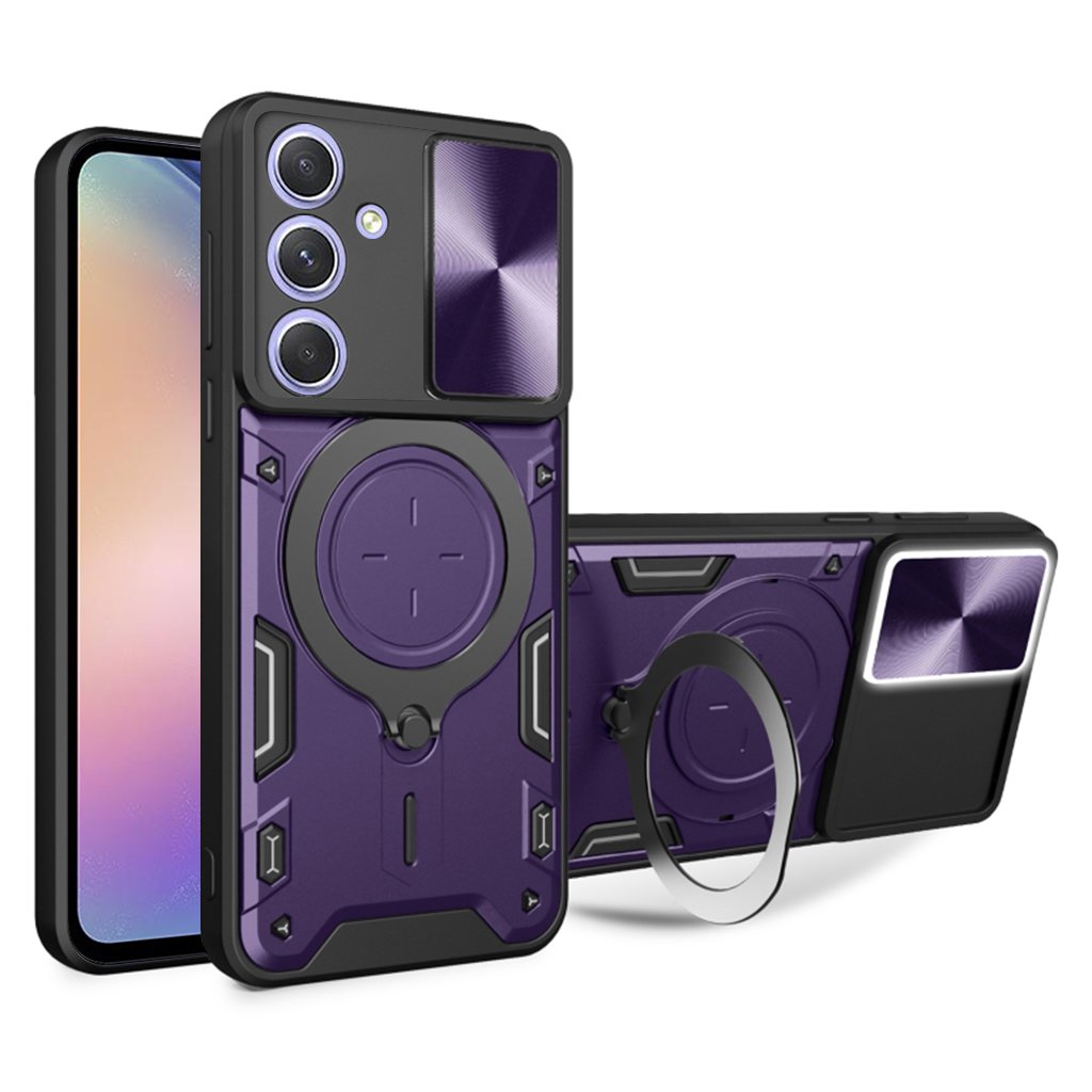 Puzdro Techsuit CamGuard Pro v elegantnej fialovej farbe sa vyznačuje robustným a moderným dizajnom. Kombinácia tmavo fialových a čiernych prvkov dodáva puzdru dynamický vzhľad. Zadná strana je opatrená integrovaným posuvným krytom pre fotoaparát s textúrou brúseného kovu, ktorý efektívne chráni šošovky pred poškriabaním a nečistotami. Ďalším praktickým prvkom je kovový krúžok, ktorý slúži ako oporný stojan pre pohodlné sledovanie obsahu alebo ako bezpečné držadlo. Zosilnené rohy a zvýšené okraje poskytujú maximálnu ochranu proti pádom a nárazom, zatiaľ čo precízne výrezy zaisťujú plnú funkčnosť všetkých portov a tlačidiel.