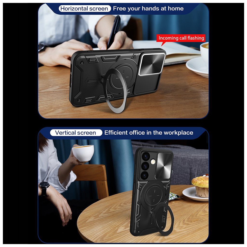 Puzdro Techsuit CamGuard Pro v elegantnej čiernej farbe je navrhnuté pre maximálnu ochranu a funkčnosť. Jeho robustná konštrukcia kombinuje mäkké TPU na spodnej časti a pevný PC panel na chrbte, doplnený o zliatinovú podporu, čo zaisťuje vysokú odolnosť proti nárazom a pádom. Dizajn sa vyznačuje posuvným krytom fotoaparátu s textúrou brúseného kovu, ktorý efektívne chráni objektívy pred poškriabaním a nečistotami, keď nie sú používané. Integrovaný otočný prstenec slúži ako praktický stojan pre horizontálne aj vertikálne sledovanie obsahu a zároveň umožňuje bezpečné uchopenie telefónu. Tento prstenec je navyše kompatibilný s magnetickými držiakmi, čo zvyšuje jeho univerzálnosť. Puzdro bolo testované na odolnosť pri páde z výšky 1,2 metra, a to 26-krát, čo podčiarkuje jeho spoľahlivosť.