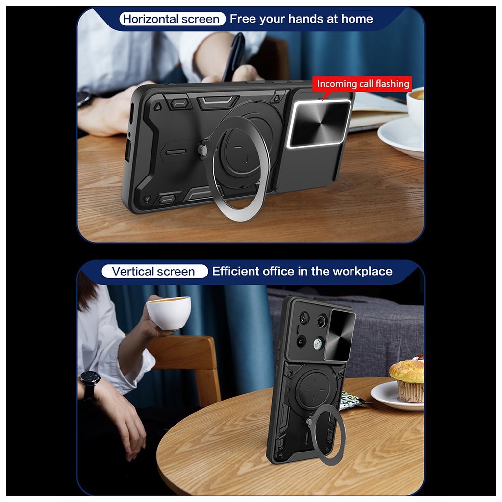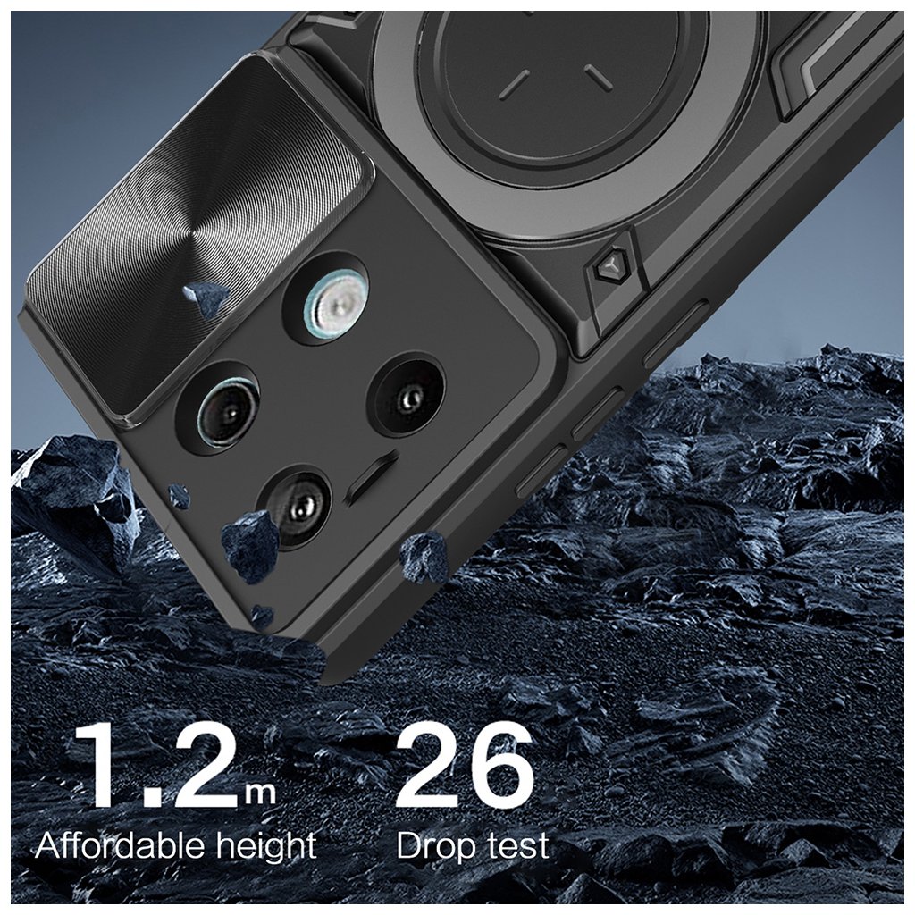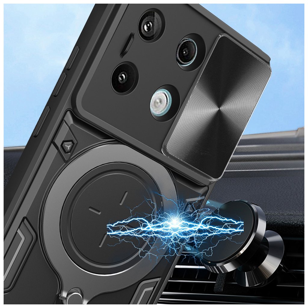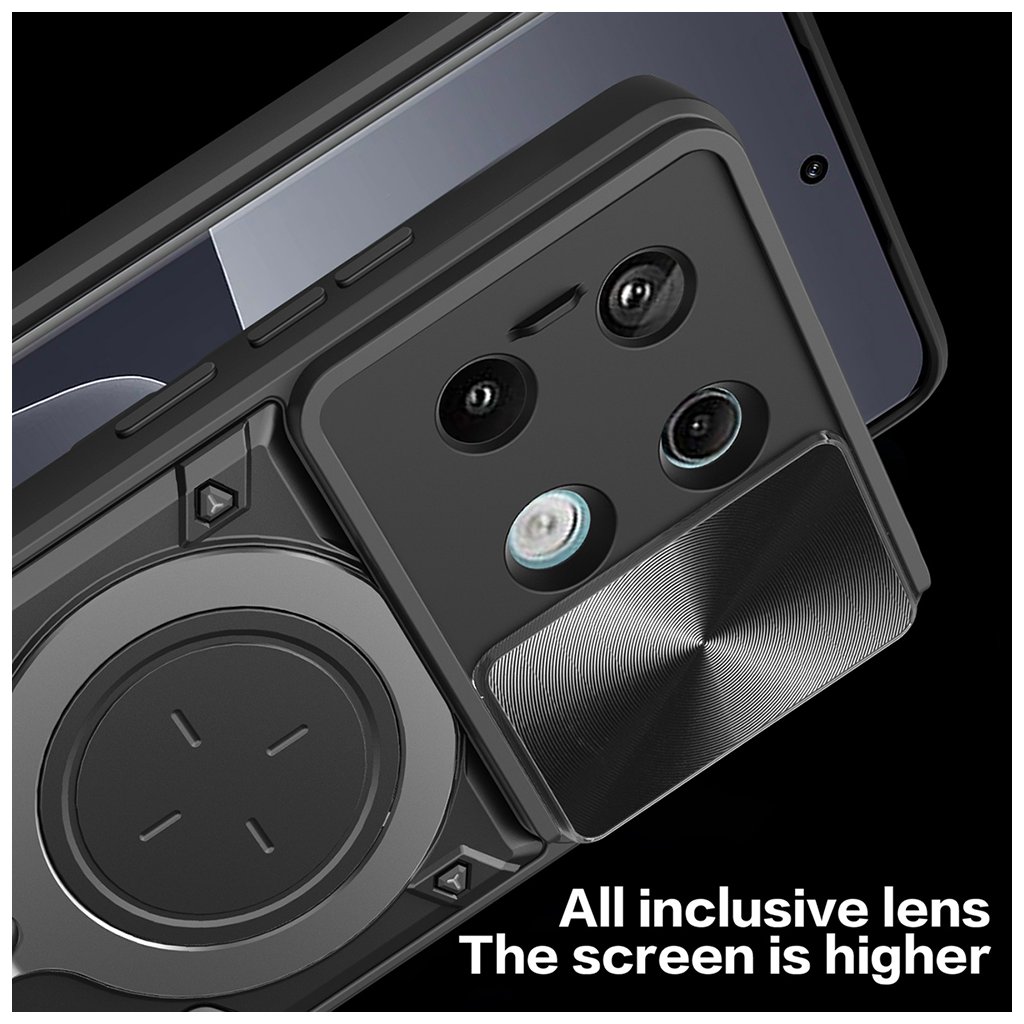 Puzdro Techsuit CamGuard Pro sa pýši robustným a funkčným dizajnom, ktorý okamžite upúta pozornosť. Jeho čierna farba dodáva telefónu sofistikovaný vzhľad, zatiaľ čo textúrované povrchy na bokoch zaisťujú pevný a istý úchop. Dominantným prvkom zadnej strany je integrovaný posuvný kryt fotoaparátu s jemnou textúrou, ktorý efektívne chráni šošovky pred poškriabaním a nečistotami. Pod ním sa nachádza multifunkčný prstenec, ktorý slúži ako praktický stojan pre sledovanie obsahu alebo ako bezpečné držadlo pre stabilnejšiu manipuláciu s telefónom. Celkový vzhľad je doplnený o precízne výrezy pre všetky konektory, mikrofóny a reproduktory, a tiež o citlivé tlačidlá, ktoré si zachovávajú istý stisk.Parametre produktu:
