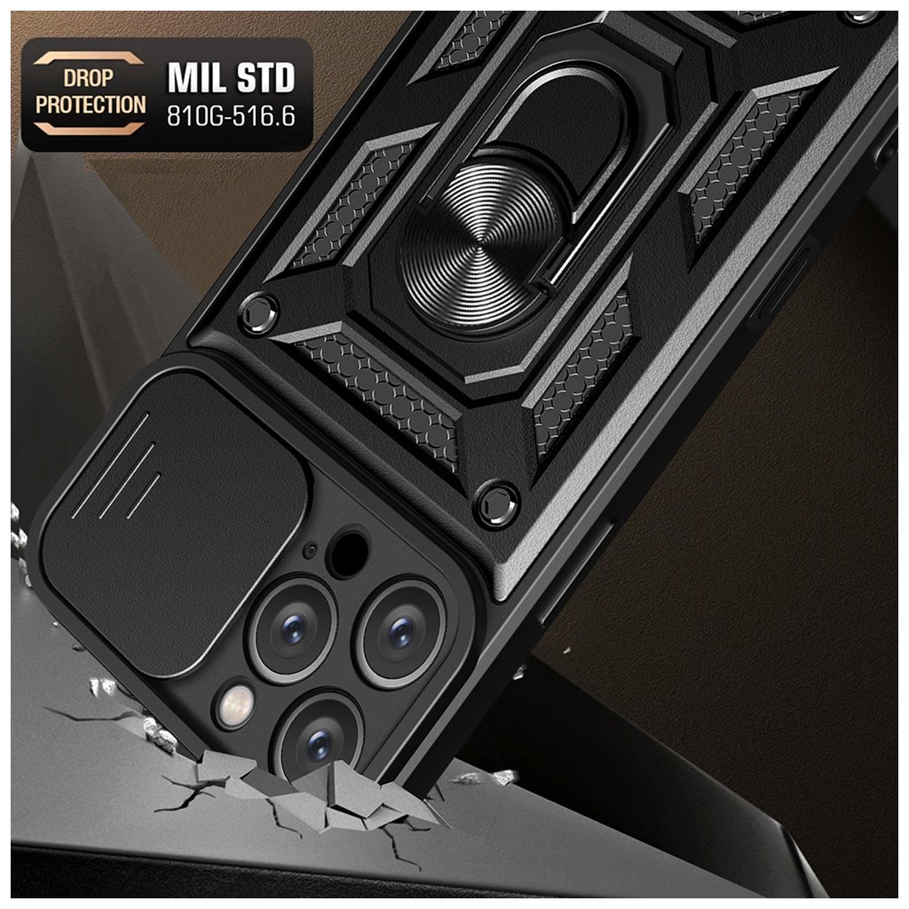 Kryt je skonštruovaný z viacerých vrstiev odolných materiálov, vrátane mäkkého TPU a pevného PC, čo zaisťuje vysokú absorpciu nárazov a ochranu proti pádom spĺňajúcu vojenský štandard MIL STD 810G-516.6. Kľúčovou vlastnosťou je posuvný kryt fotoaparátu (CamShield), ktorý chráni šošovky pred poškriabaním a nečistotami, keď nie sú používané, a zároveň zaisťuje vaše súkromie.