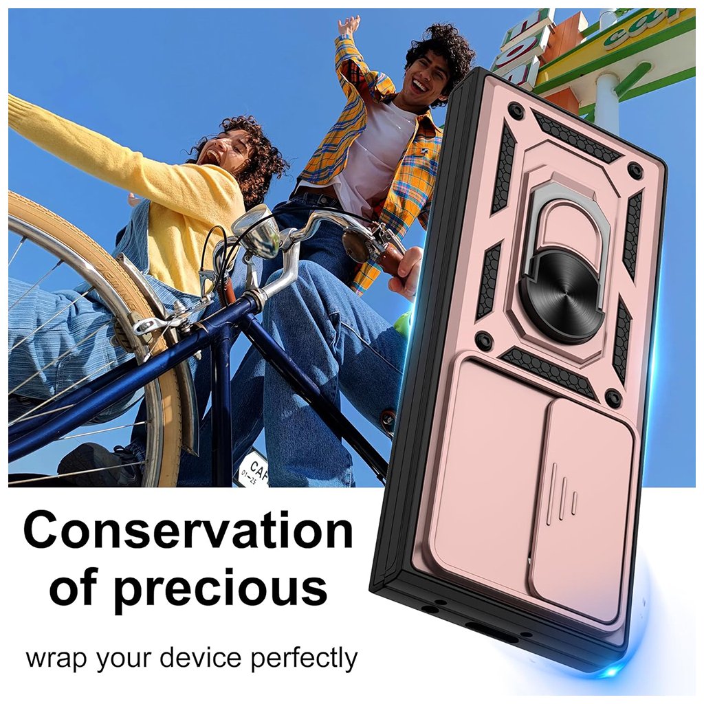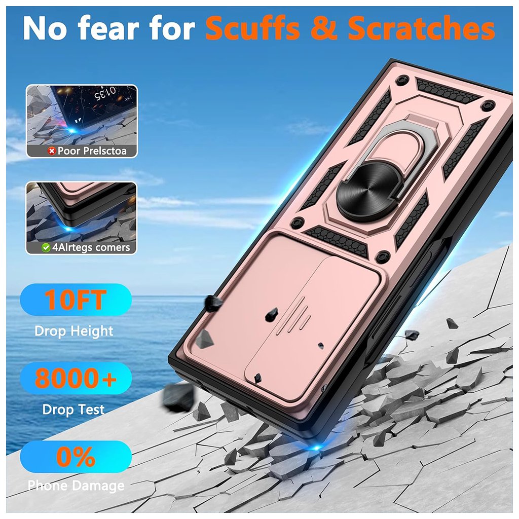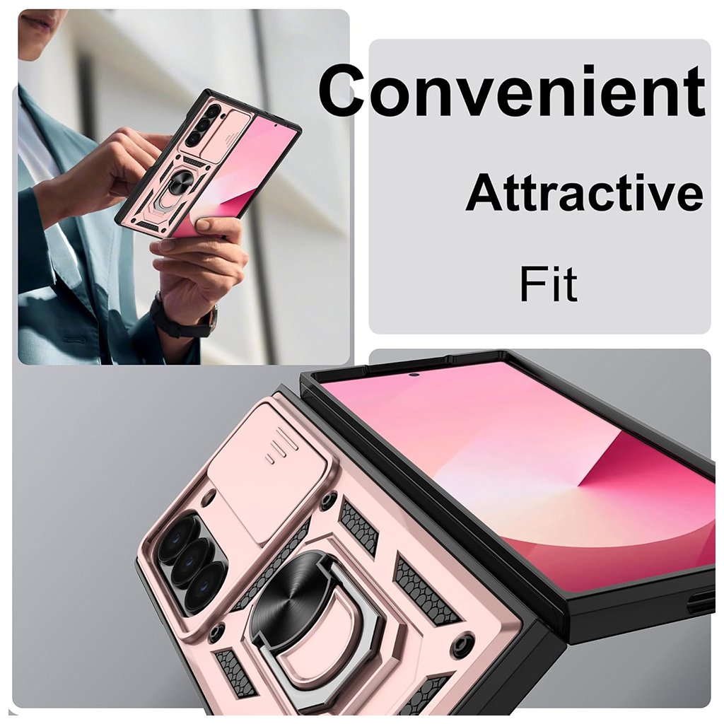 Puzdro Techsuit CamShield Series sa pýši robustným a moderným dizajnom, ktorý nielen skvele vyzerá, ale predovšetkým chráni. Jeho konštrukcia kombinuje pevné materiály v ružovo zlatom odtieni s odolnými čiernymi prvkami, ktoré absorbujú nárazy a zaisťujú vysokú odolnosť proti pádom a poškriabaniu. Zvýšené okraje okolo displeja (1,5 mm) a fotoaparátu poskytujú efektívnu ochranu proti poškodeniu pri položení telefónu na rovný povrch. Jedným z kľúčových prvkov je integrovaný posuvný kryt fotoaparátu (CamShield), ktorý chráni citlivé objektívy pred poškriabaním a prachom a zároveň zaisťuje vaše súkromie. Na zadnej strane nájdete aj praktický 360° otočný krúžok, ktorý slúži ako bezpečný úchyt a zároveň ako stabilný stojan pre pohodlné sledovanie obsahu v horizontálnej polohe. Puzdro je navrhnuté tak, aby perfektne obopínalo váš Samsung Galaxy Z Fold7 a chránilo aj jeho kĺb, čo je pre skladacie telefóny zásadné.