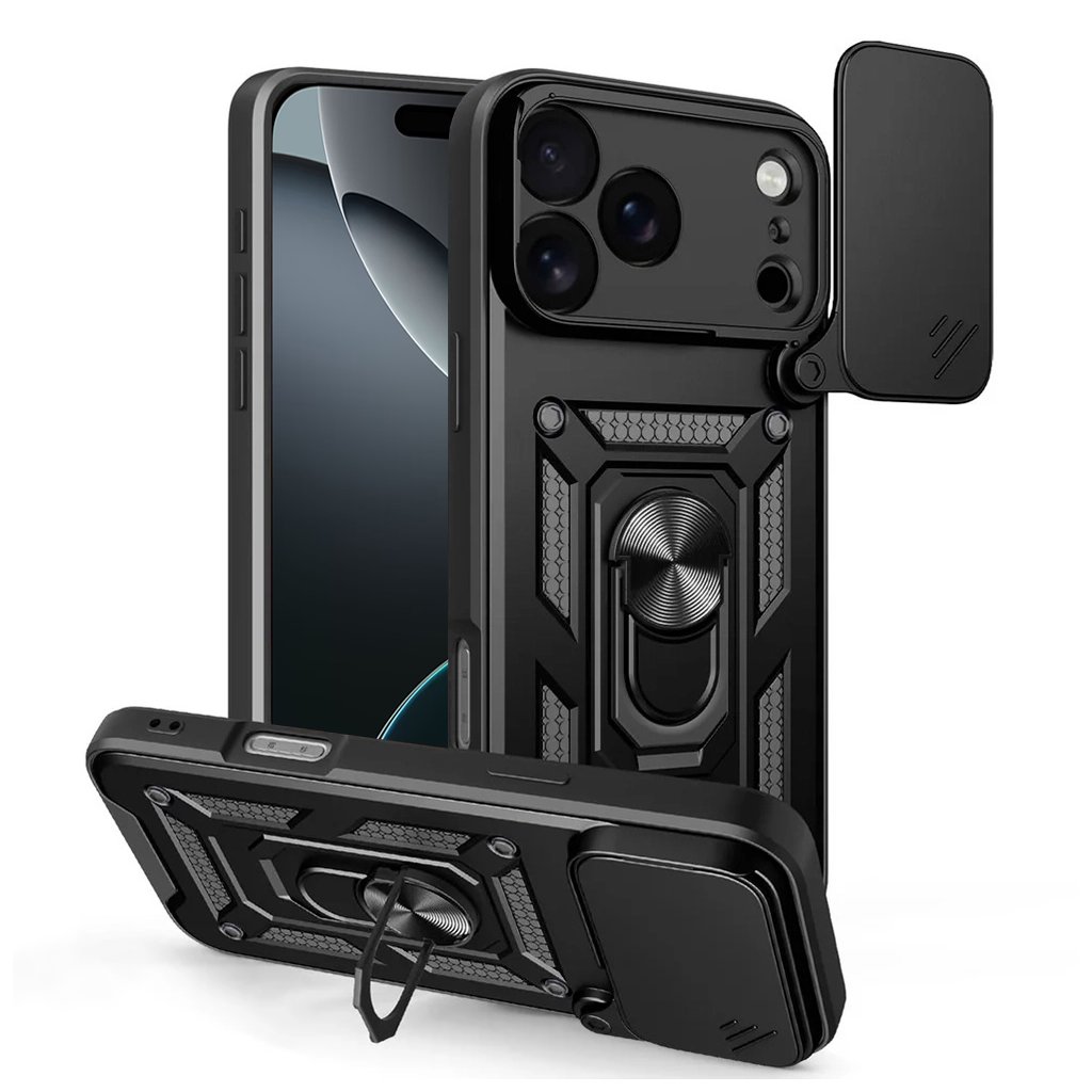 Puzdro Techsuit CamShield Series sa pýši odolným a taktickým dizajnom v elegantnej čiernej farbe. Jeho zadná strana je opatrená výraznými geometrickými vzormi a textúrami, ktoré nielen skvele vyzerajú, ale aj zlepšujú úchop a odolnosť proti nárazom. Kľúčové vlastnosti: * **Integrovaný posuvný kryt fotoaparátu (CamShield):** Efektívne chráni citlivé objektívy vášho iPhone 17 Pro Max pred poškriabaním a nečistotami, keď ich nepoužívate. * **Multifunkčný kovový krúžok:** * Slúži ako bezpečný držiak pre pohodlné ovládanie telefónu jednou rukou. * Je otočný o 360 stupňov. * Možno ho ľahko premeniť na praktický stojan pre sledovanie videí či videohovory v horizontálnej polohe. * Je kompatibilný s magnetickými držiakmi do auta. * **Komplexná ochrana:** Puzdro je navrhnuté tak, aby poskytovalo komplexnú ochranu proti pádom a otrasom.Prečo zvoliť značku Techsuit?