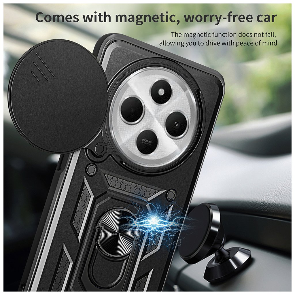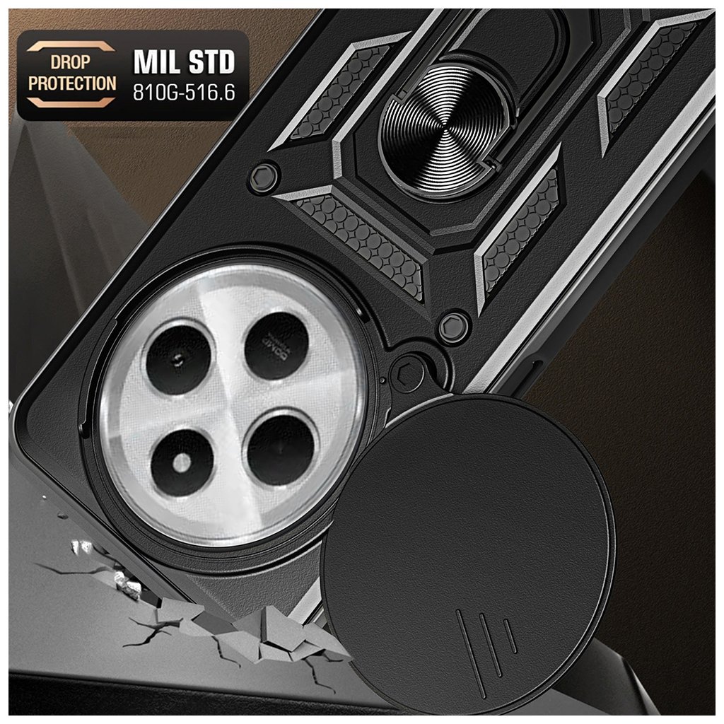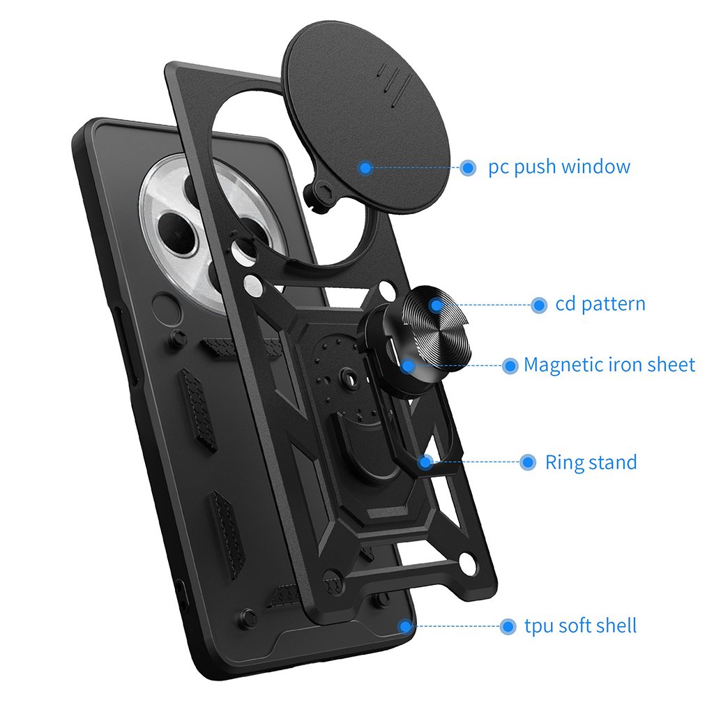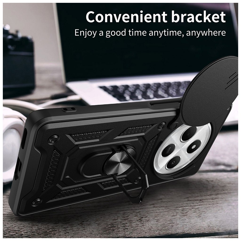 Dominantným prvkom je integrovaný posuvný kryt fotoaparátu, ktorý efektívne chráni šošovky pred poškriabaním a nečistotami, a zároveň zaisťuje vaše súkromie. Uprostred zadnej strany je umiestnený otočný kovový krúžok, ktorý slúži ako praktický stojan pre sledovanie obsahu alebo ako bezpečný úchyt pre prst, čo zvyšuje komfort a bezpečnosť pri manipulácii s telefónom.