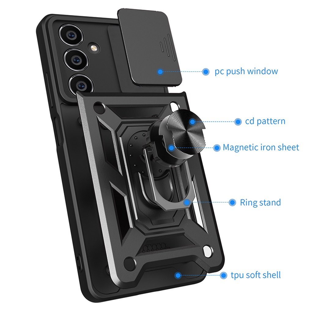 - Uprostred sa nachádza integrovaný kovový krúžok, ktorý slúži ako praktický stojan pre sledovanie obsahu alebo ako bezpečný držiak telefónu.