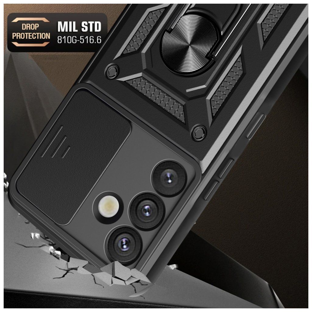 Na zadnej strane puzdra nájdete integrovaný kovový krúžok, ktorý slúži ako praktický stojan pre pohodlné sledovanie obsahu bez použitia rúk. Krúžok je možné tiež využiť ako bezpečný úchyt pre lepšiu manipuláciu s telefónom. Navyše je vybavený magnetickou kovovou doštičkou, ktorá zaisťuje kompatibilitu s magnetickými držiakmi do auta, čo ocení každý vodič. Puzdro je vyrobené z kombinácie odolného TPU materiálu a pevného PC, čo zaručuje vysokú odolnosť proti nárazom a pádom, spĺňajúcu štandardy MIL STD 810G-516.6 pre ochranu proti pádu. Presné výrezy pre konektory, mikrofóny, reproduktory a fotoaparáty zaisťujú plnú funkčnosť vášho zariadenia, zatiaľ čo tlačidlá ponúkajú istý a príjemný stisk.