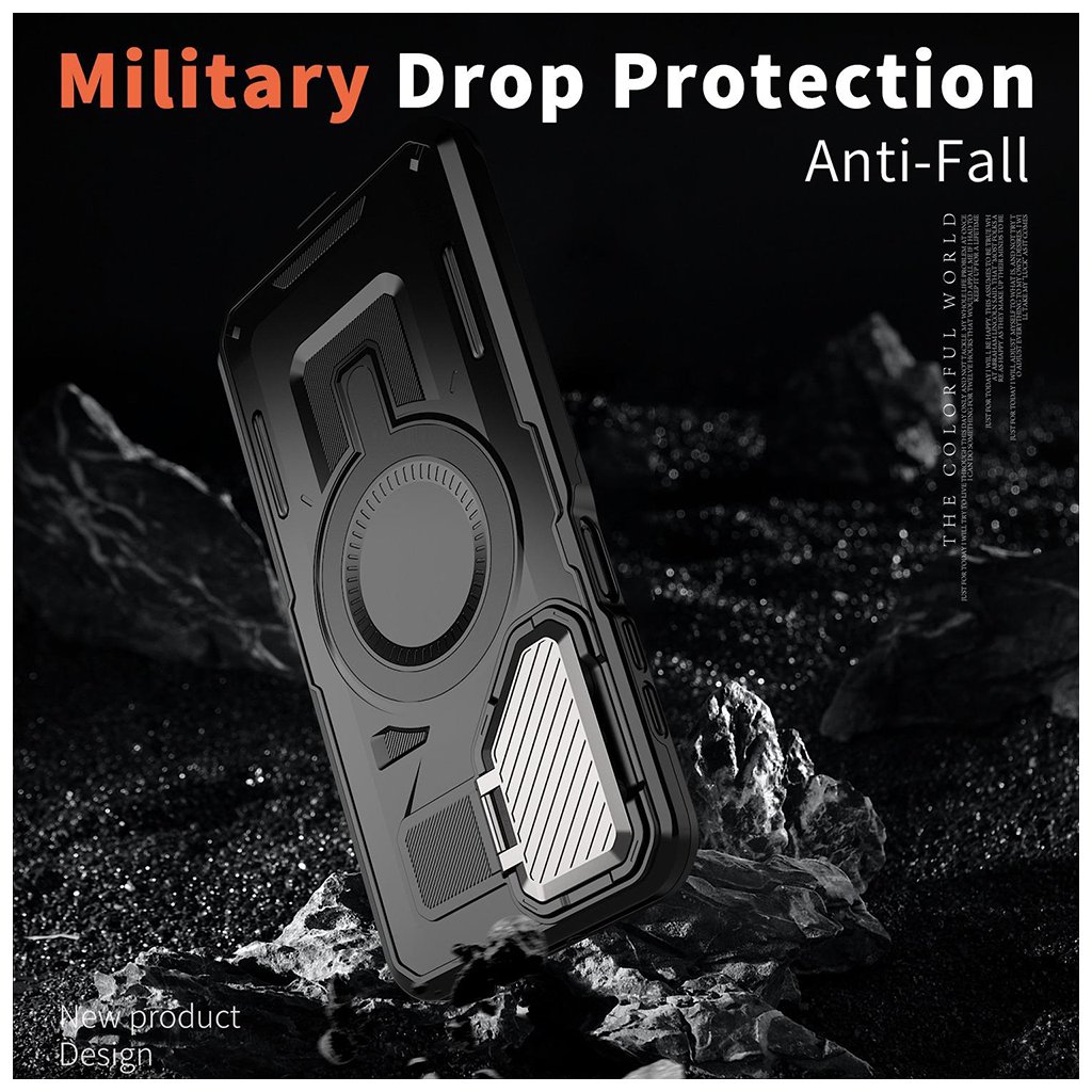 - Celkový vzhľad puzdra podčiarkuje jeho taktický a odolný charakter, ktorý je navrhnutý tak, aby obstál aj v náročných podmienkach a poskytol vojenskú úroveň ochrany proti pádu.