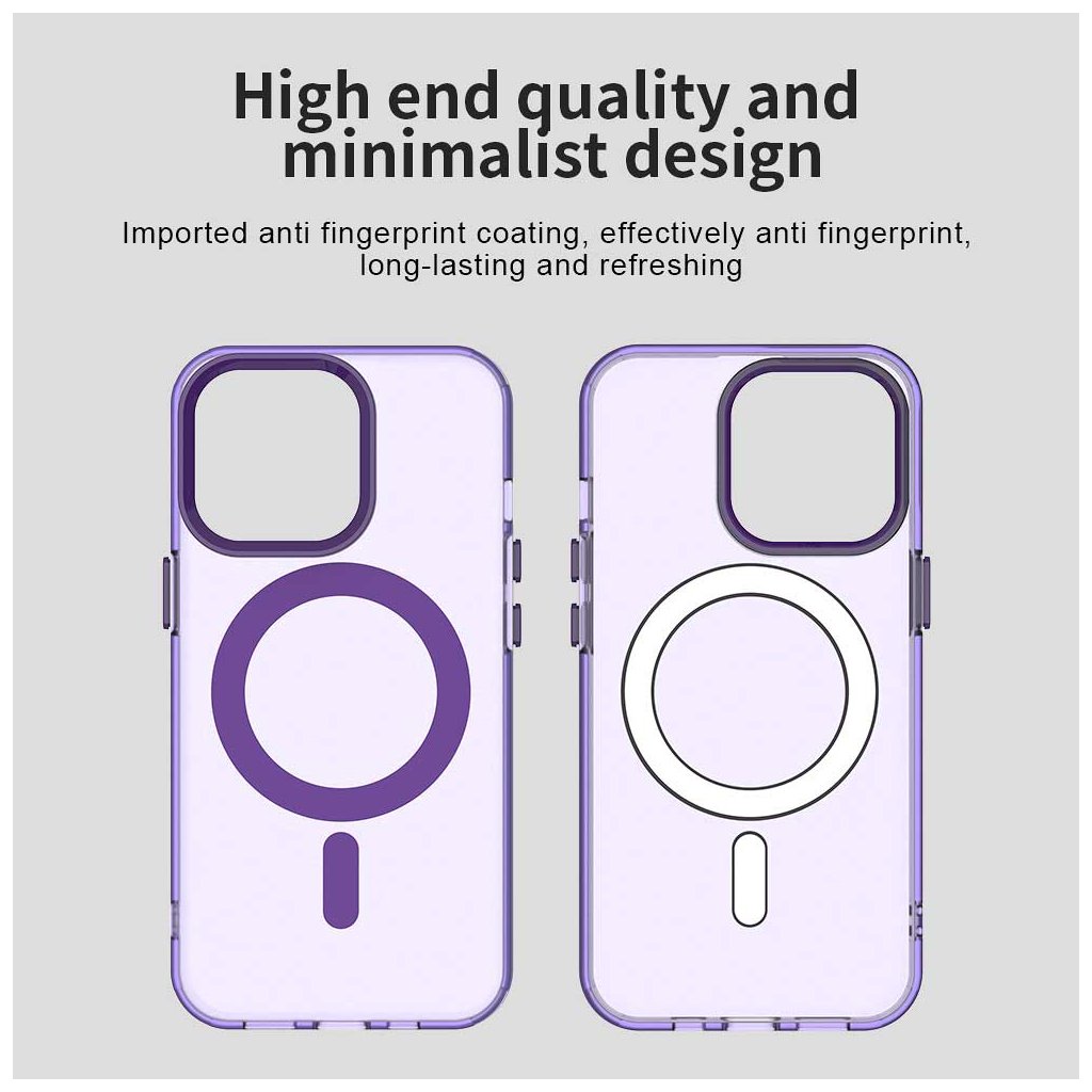 - MagSafe kompatibilita: Na zadnej strane je integrovaný výrazný fialový MagSafe krúžok, zaisťujúci plnú kompatibilitu s MagSafe príslušenstvom a bezproblémové magnetické nabíjanie.