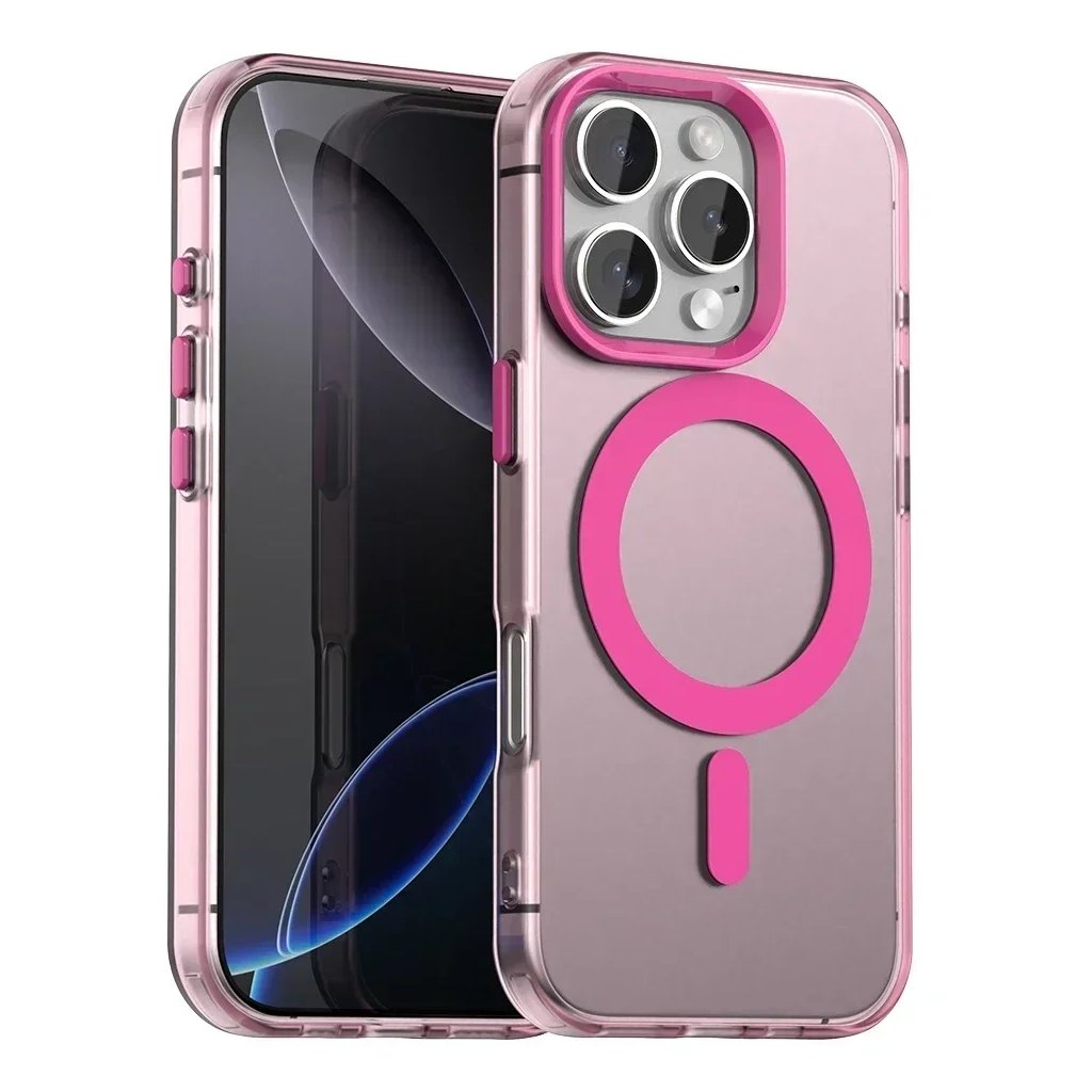 Techsuit CandyCase MagSafe pre iPhone 16 Pro Max sa vyznačuje moderným a minimalistickým dizajnom. Kryt je vyrobený z kombinácie priehľadného a polopriehľadného materiálu, ktorý necháva vyniknúť originálnej farbe vášho telefónu. Okraje krytu, rovnako ako tlačidlá hlasitosti a napájania, sú prevedené v žiarivej ružovej farbe, ktorá dodáva puzdru hravý a svieži vzhľad.