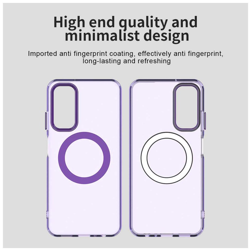 Puzdro Techsuit CandyCase MagSafe sa pýši priesvitným fialovým prevedením, ktoré decentne podčiarkuje originálny vzhľad vášho Samsung Galaxy A05s. Na zadnej strane je integrovaný výrazný MagSafe krúžok v sýto fialovej farbe, ktorý zaisťuje kompatibilitu s MagSafe príslušenstvom a zároveň dodáva puzdru moderný a štýlový akcent. Oblasť okolo fotoaparátu je taktiež elegantne zvýraznená tmavším fialovým rámčekom, čo nielen chráni šošovky, ale aj esteticky dopĺňa celkový vzhľad. Puzdro je vyrobené z flexibilného materiálu, pravdepodobne TPU, ktorý zaručuje jednoduchú inštaláciu a efektívne tlmenie nárazov.