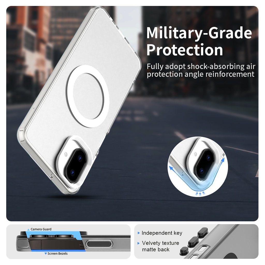 - MagSafe krúžok: Na zadnej strane je integrovaný výrazný biely MagSafe krúžok, ktorý zaisťuje kompatibilitu s MagSafe príslušenstvom a umožňuje jednoduché a pevné uchytenie.