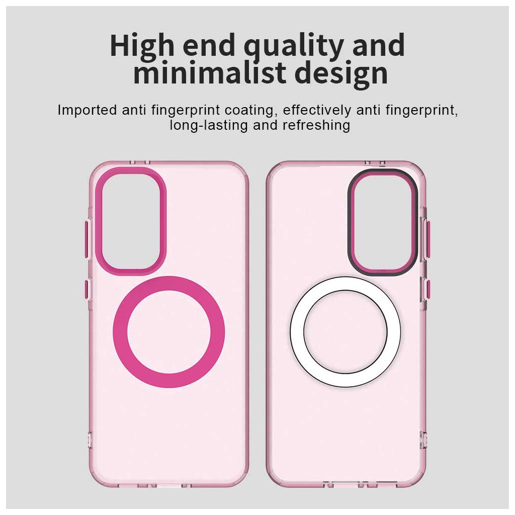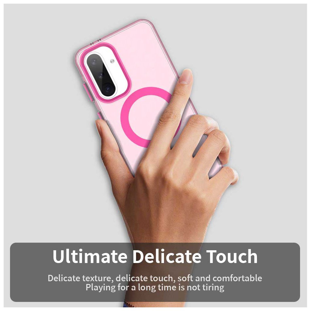 Kryt Techsuit CandyCase MagSafe je navrhnutý s dôrazom na minimalistickú eleganciu a maximálnu funkčnosť. Jeho priehľadné ružové prevedenie necháva vyniknúť originálnej farbe vášho telefónu, zatiaľ čo výrazný ružový MagSafe krúžok na zadnej strane dodáva moderný a praktický prvok. Tlačidlá hlasitosti a napájania sú rovnako v ružovej farbe, čo vytvára harmonický celok.