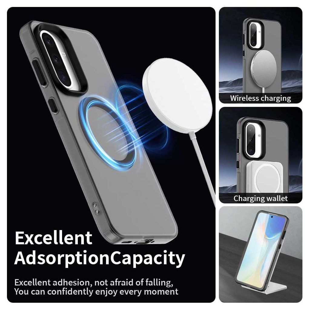 Puzdro Techsuit CandyCase MagSafe pre Samsung Galaxy A56 5G v elegantnej čiernej farbe sa vyznačuje minimalistickým a funkčným dizajnom. Zadná strana je vyrobená z priesvitného, matného materiálu, ktorý decentne odhaľuje pôvodnú farbu telefónu a zároveň zabraňuje usadzovaniu odtlačkov prstov. Okraje puzdra sú z tmavého, pravdepodobne silikónového materiálu, ktorý zaisťuje pevný úchop a zvýšenú ochranu proti nárazom. Dominantným prvkom na zadnej strane je integrovaný čierny MagSafe krúžok. Oblasť okolo fotoaparátu je precízne ohraničená zvýšeným rámčekom v čiernej farbe, čo poskytuje dodatočnú ochranu objektívom. Celkový vzhľad je moderný, čistý a praktický.Dodatočné parametre