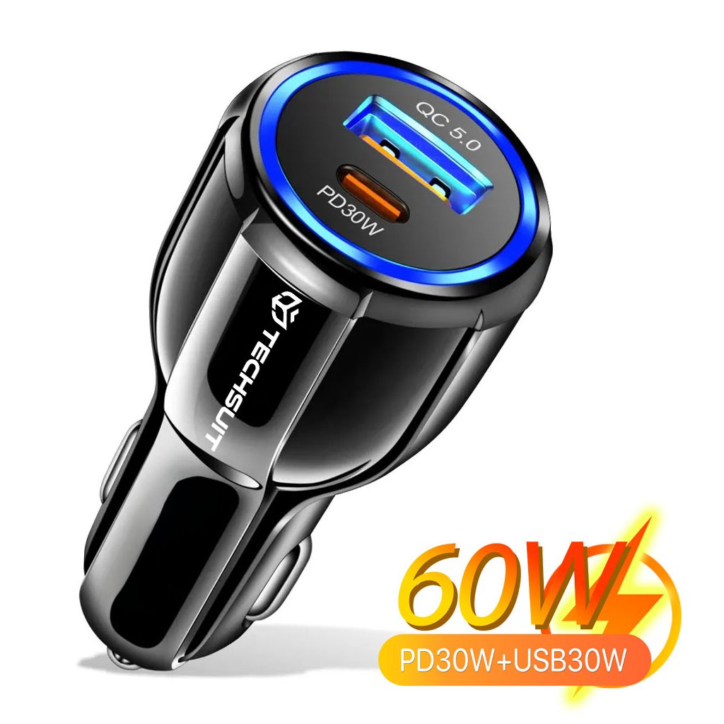 Techsuit Prémiová Autonabíjačka TE-022 USB-A QC5.0 30W USB-C PD30W 60W LED čiernaRýchle a bezpečné nabíjanie na cestách
