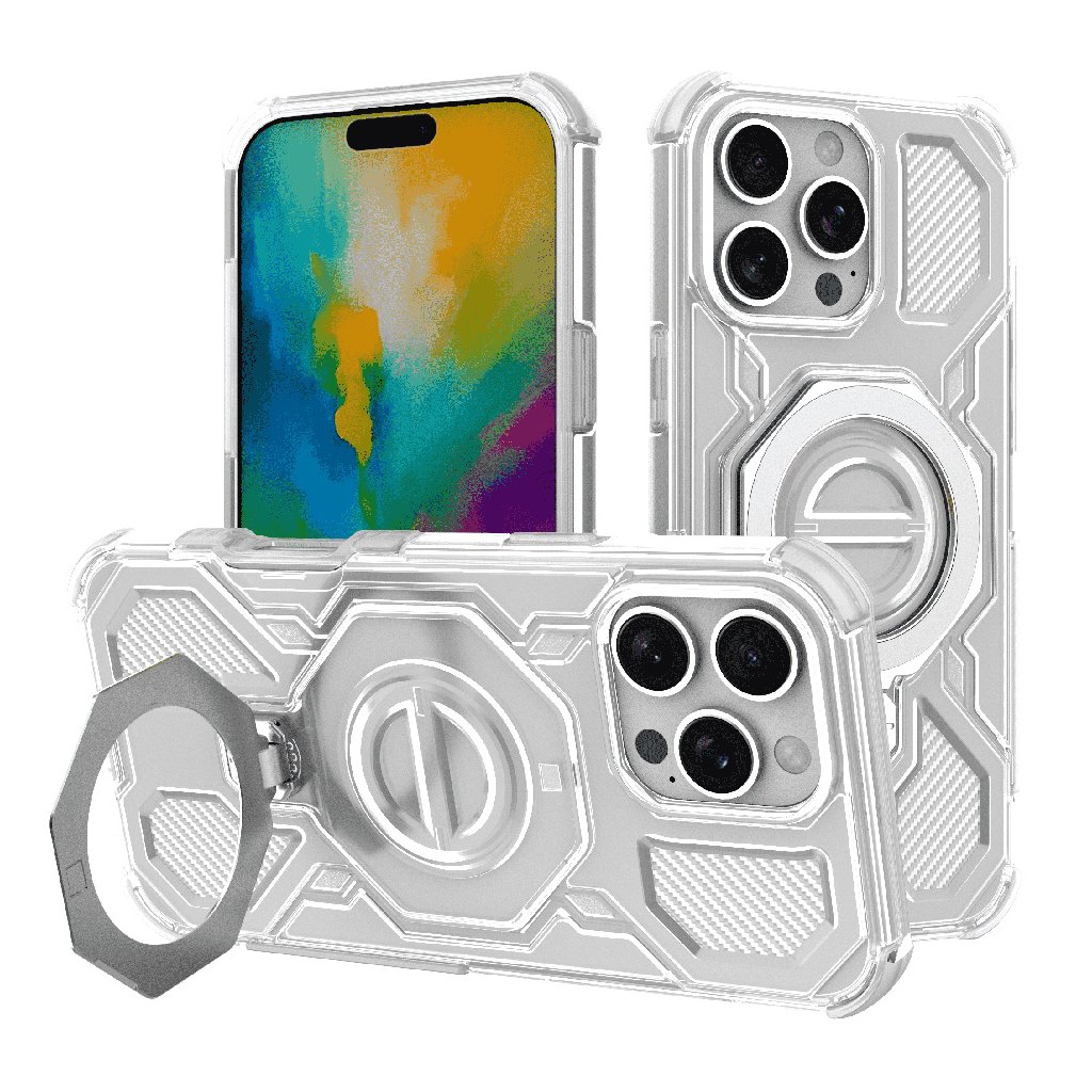 - Kľúčovým prvkom je integrovaný otočný krúžok, ktorý slúži ako praktický stojanček pre sledovanie obsahu alebo ako bezpečný úchyt pre pohodlné držanie telefónu.