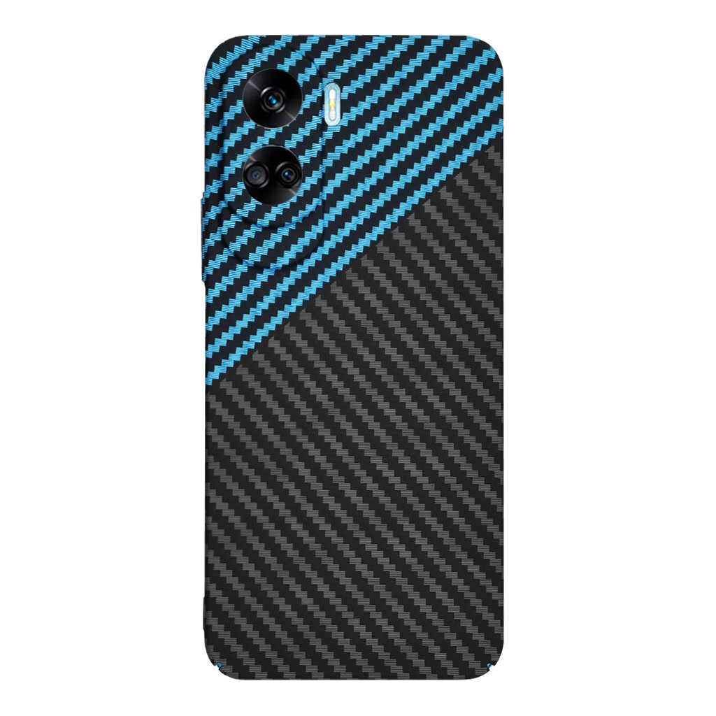 - Horná časť, vrátane oblasti okolo výrezov pre fotoaparáty, je oživená výraznou modrou farbou, taktiež s textúrou karbónových vlákien, čo vytvára pútavý kontrast a dodáva puzdru športový nádych.