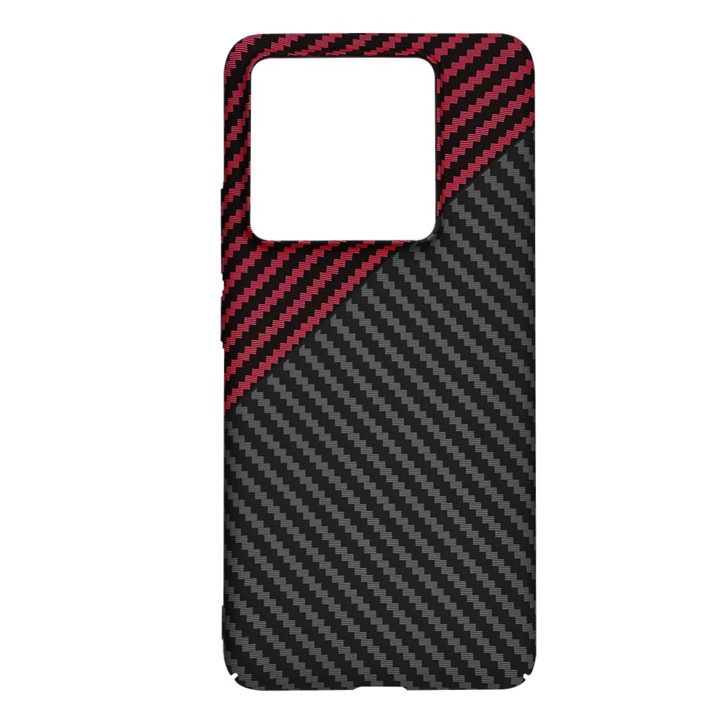 Puzdro Techsuit Carbonite FiberShell v prevedení Red Vortex pre Xiaomi 14T Pro sa pýši moderným a dynamickým dizajnom. Zadná strana je prevažne pokrytá elegantnou textúrou karbónových vlákien v tmavosivých a čiernych tónoch, ktorá dodáva puzdru športový a sofistikovaný vzhľad. Horná ľavá časť, obklopujúca modul fotoaparátu, je zvýraznená výrazným červeným pruhom s diagonálnym vzorom, ktorý vytvára atraktívny kontrast a podčiarkuje celkovú estetiku.