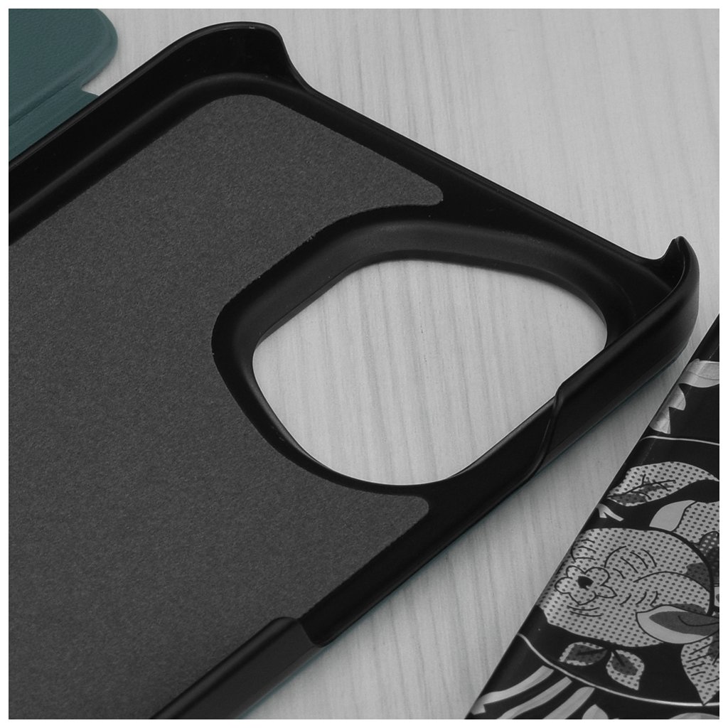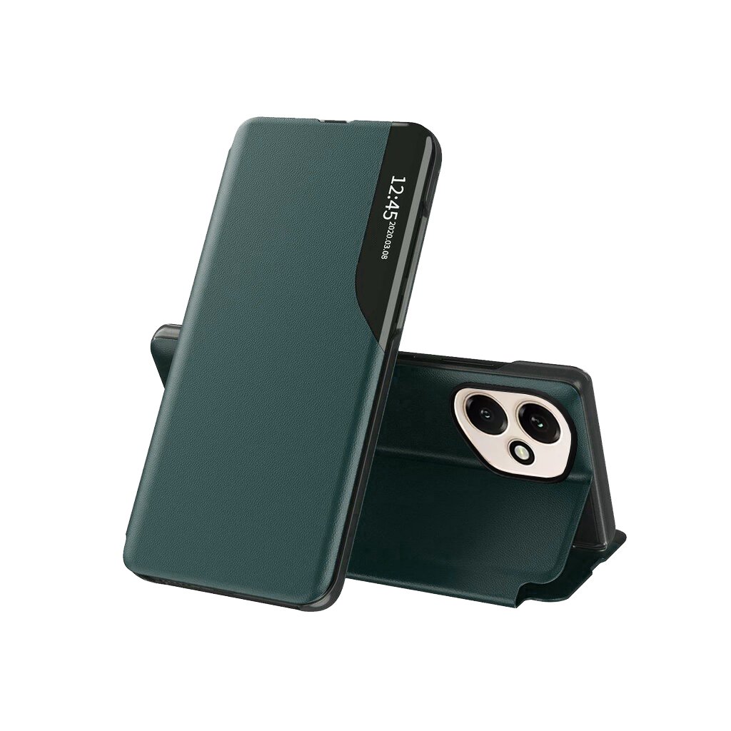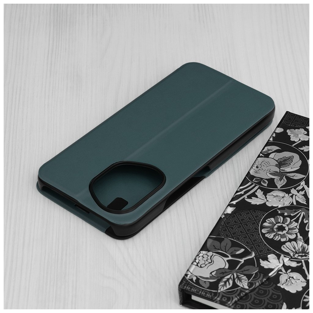 Toto flipové puzdro je navrhnuté s dôrazom na modernú estetiku a praktickosť. Jeho tmavozelený povrch s jemnou textúrou, pripomínajúcou kožu, dodáva telefónu sofistikovaný vzhľad a zároveň zaisťuje príjemný a pevný úchop. Kľúčovým prvkom dizajnu je priehľadný vertikálny pruh na prednej strane, ktorý umožňuje rýchly náhľad na čas, dátum a notifikácie bez nutnosti otvárať puzdro. Vďaka precíznemu spracovaniu sú všetky výrezy pre konektory, mikrofóny, reproduktory a fotoaparáty dokonale zarovnané, čo zaručuje plnú funkčnosť vášho zariadenia. Puzdro sa navyše dá ľahko zložiť do praktického stojana, ideálneho na sledovanie videí alebo videohovory.