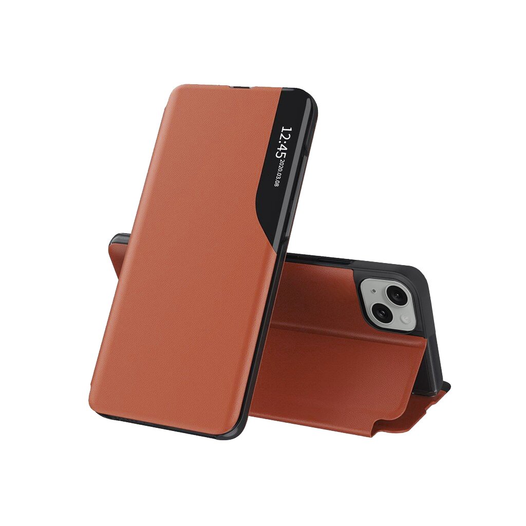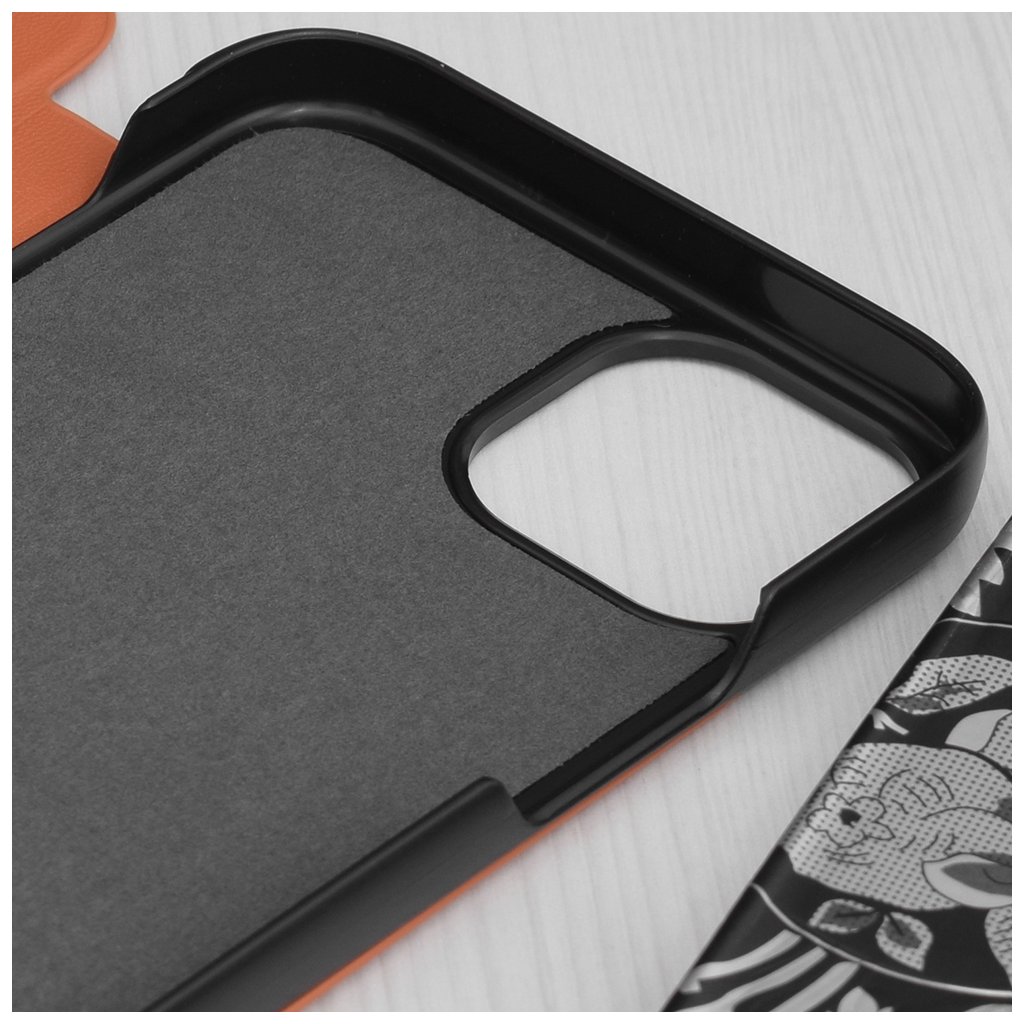 Dizajn puzdra eFold Series je premyslený do posledného detailu. Vonkajšia strana je vyrobená z materiálu s jemnou textúrou, pripomínajúcou kožu, čo dodáva puzdru luxusný vzhľad a príjemný pocit na dotyk. Dominantou prednej strany je elegantné vertikálne priehľadné okienko, ktoré umožňuje rýchly prehľad o čase, dátume a notifikáciách bez toho, aby ste museli puzdro otvárať. Čierne okraje puzdra vytvárajú štýlový kontrast s oranžovým povrchom a podčiarkujú modernú estetiku. Vďaka svojej konštrukcii je možné puzdro ľahko zložiť do praktického stojanu, čo oceníte pri sledovaní videí alebo videohovoroch.