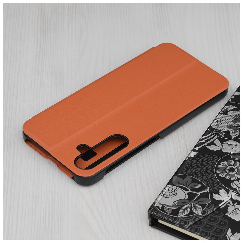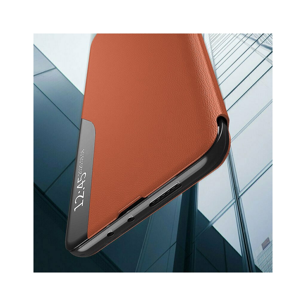 - Predný odklápací kryt je vybavený priehľadným vertikálnym pruhom, ktorý umožňuje ľahký náhľad na dôležité informácie, ako je čas a notifikácie, bez toho, aby ste museli puzdro otvárať.