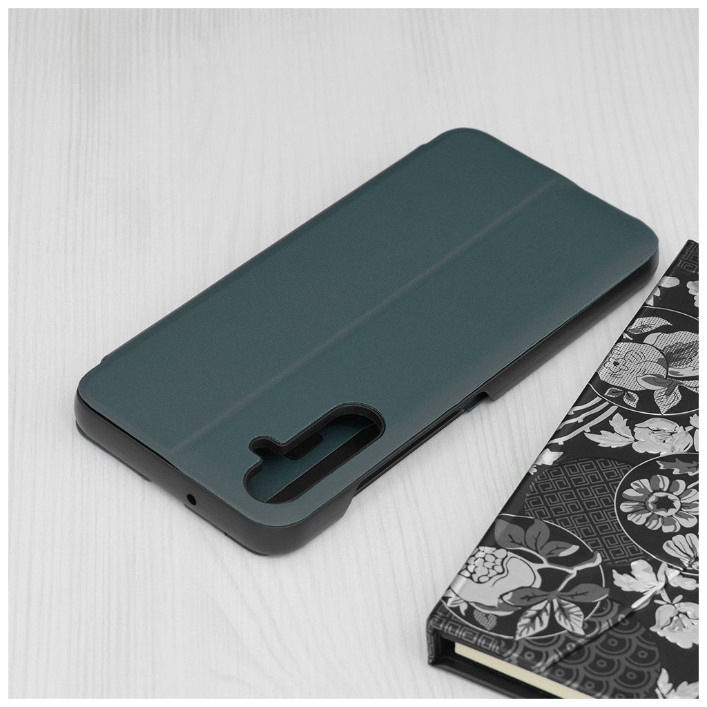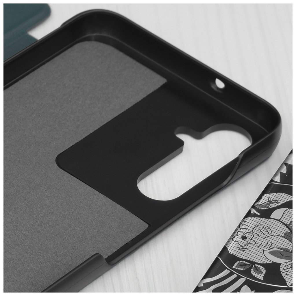 Puzdro eFold Series sa vyznačuje moderným a praktickým dizajnom. Jeho tmavě zelená farba dodáva telefónu luxusný a decentný vzhľad. Predná strana puzdra disponuje priehľadným okienkom, ktoré umožňuje rýchly náhľad na čas, dátum a notifikácie, aniž by ste museli puzdro otvárať.