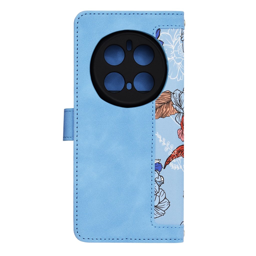 - Predná odklápacia časť zdobí jemný kvetinový vzor s kvetmi v modrých, bielych a oranžových tónoch, doplnený zelenými lístkami, čo dodáva puzdru svieži a elegantný vzhľad.