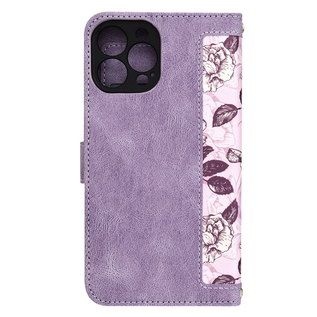- Po otvorení puzdra vás očarí vnútorná strana s nádherným kvetinovým motívom ruží a motýľa na svetlejšom fialovo-ružovom podklade, ktorý dodáva puzdru osobitý a ženský šarm.