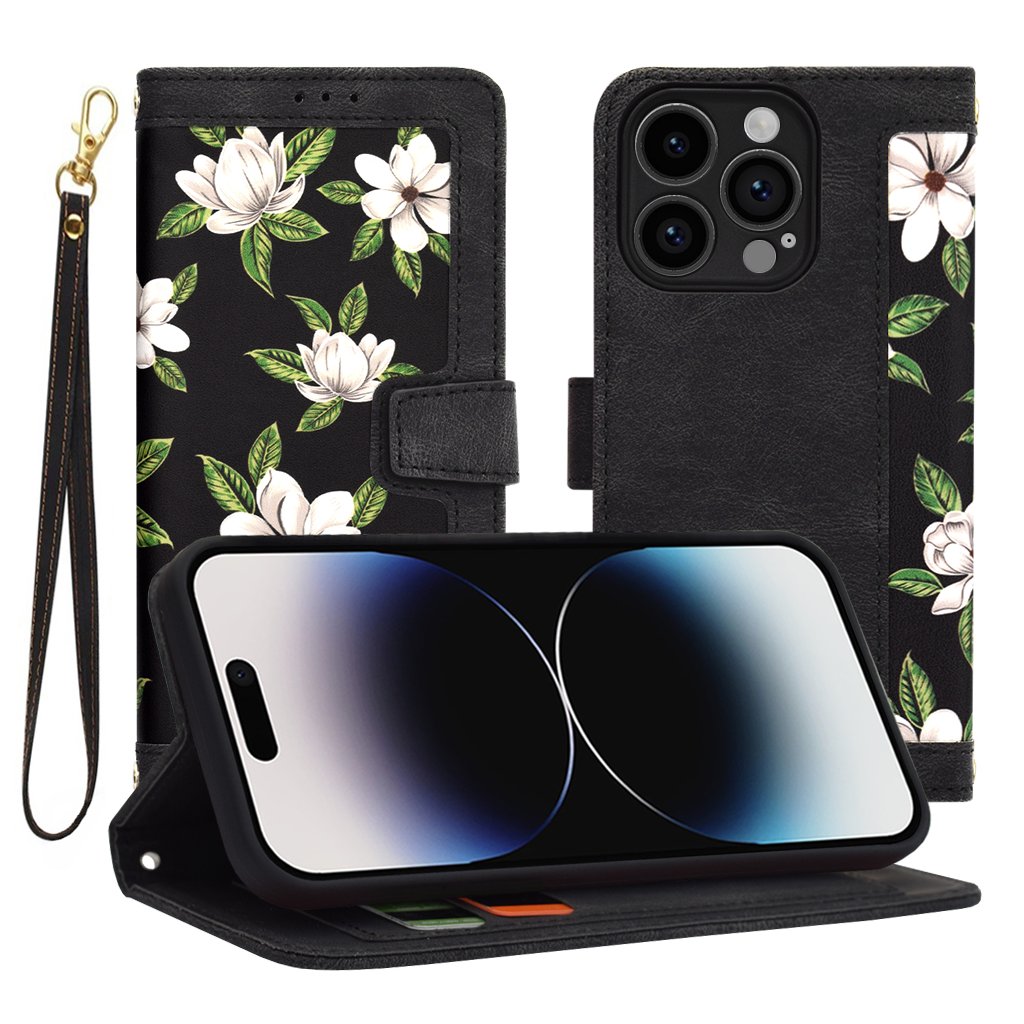 - Vonkajšia strana flipového krytu je zdobená nádherným kvetinovým vzorom bielych kvetov pripomínajúcich magnólie s detailnými zelenými listami, ktoré kontrastujú s elegantným čiernym pozadím. Tento motív dodáva puzdru svieži a zároveň luxusný vzhľad.