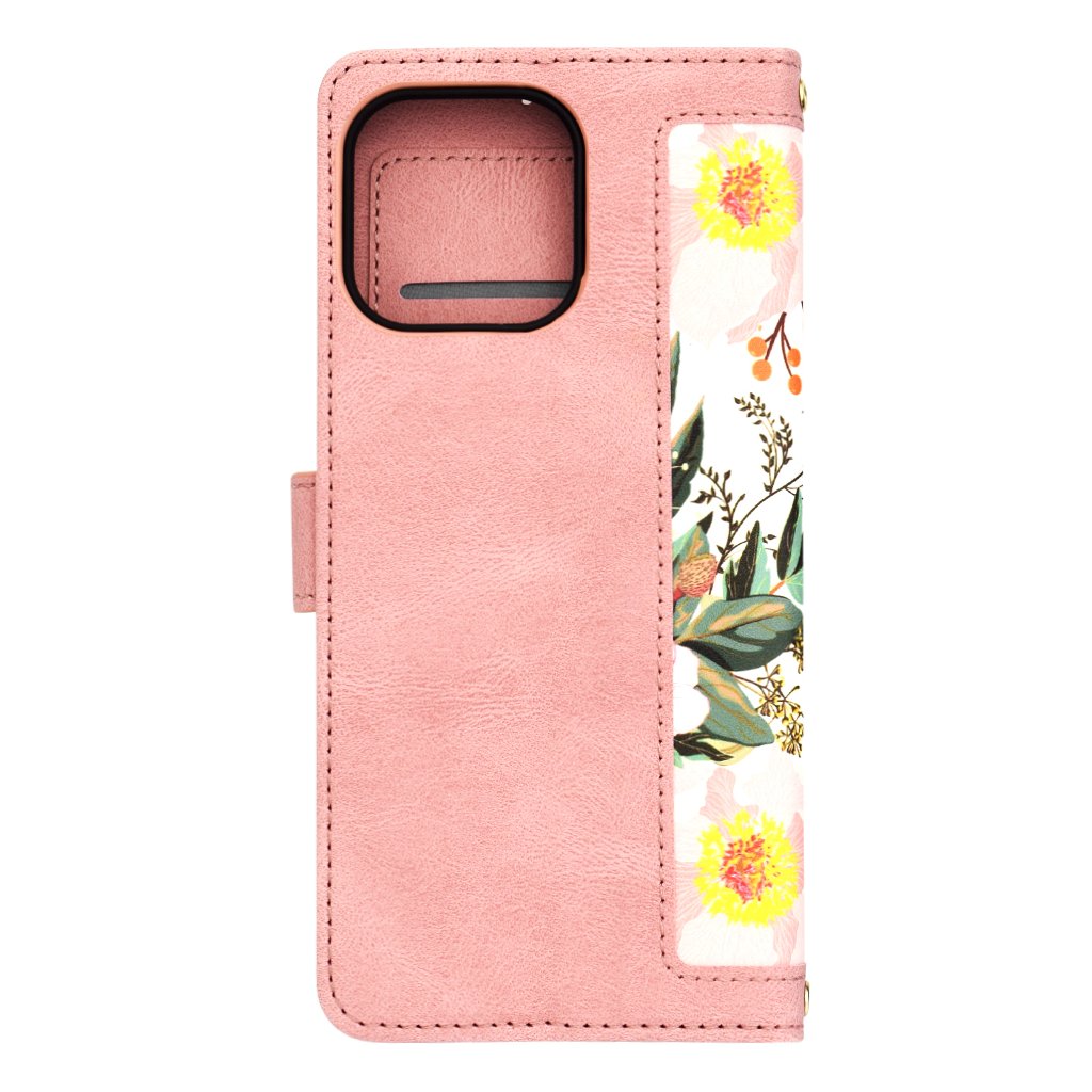 - Vnútorná strana flipového puzdra odhaľuje krásny kvetinový vzor s dominantnými žltými a bielymi kvetmi a zelenými listami na svetlom pozadí, čo dodáva puzdru svieži a romantický vzhľad.