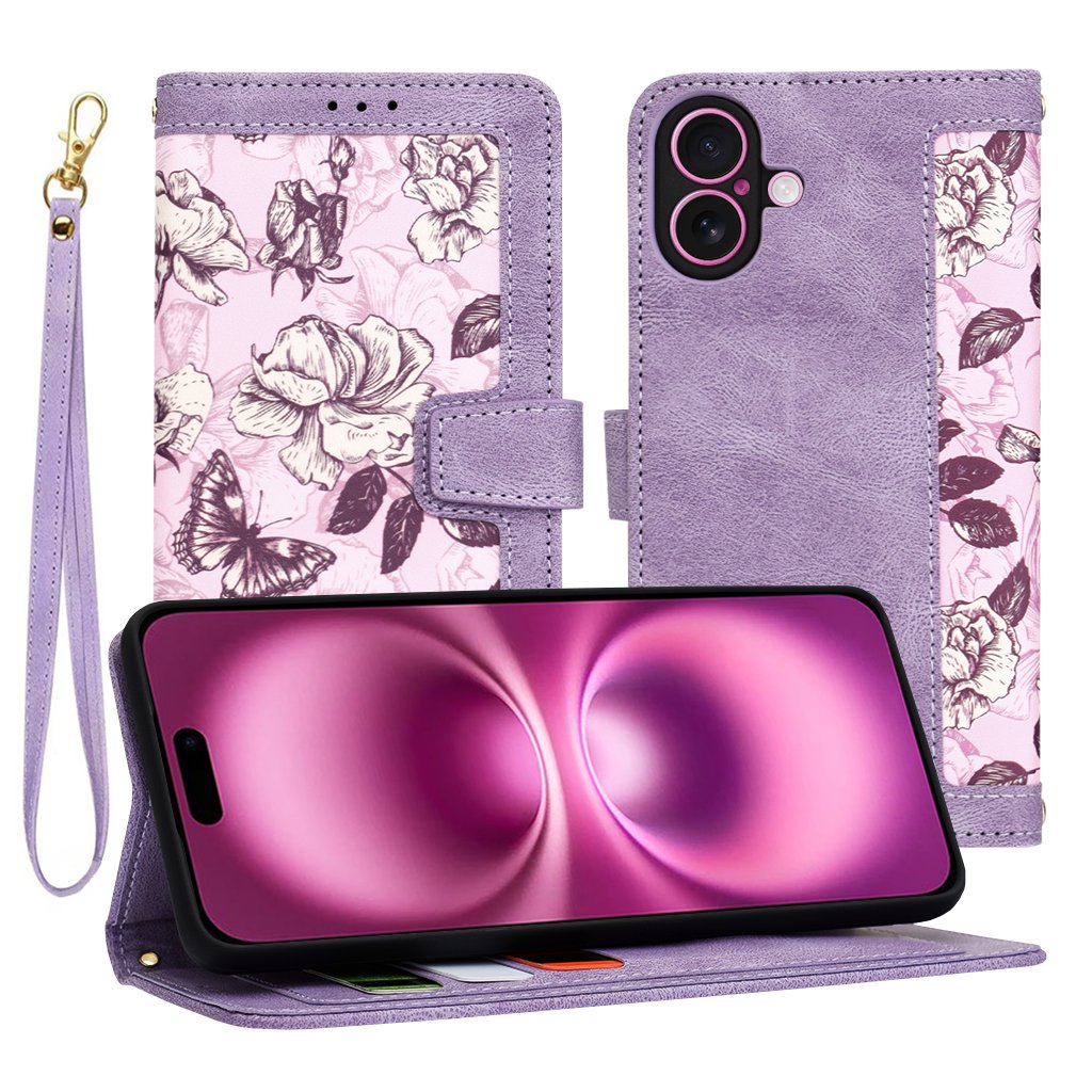- Vnútorná strana predného flipu a dekoratívny pruh na vonkajšej strane sú zdobené svetlejším, ružovo-fialovým podkladom s jemným kvetinovým motívom ruží a motýľa, ktorý dodáva puzdru nádych romantiky a originality.