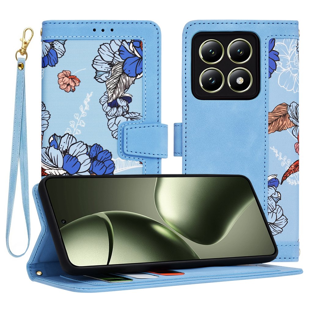 - Predná strana puzdra je zdobená nádherným kvetinovým vzorom v odtieňoch modrej, oranžovej a bielej, ktorý dodáva puzdru jedinečný a svieži vzhľad.