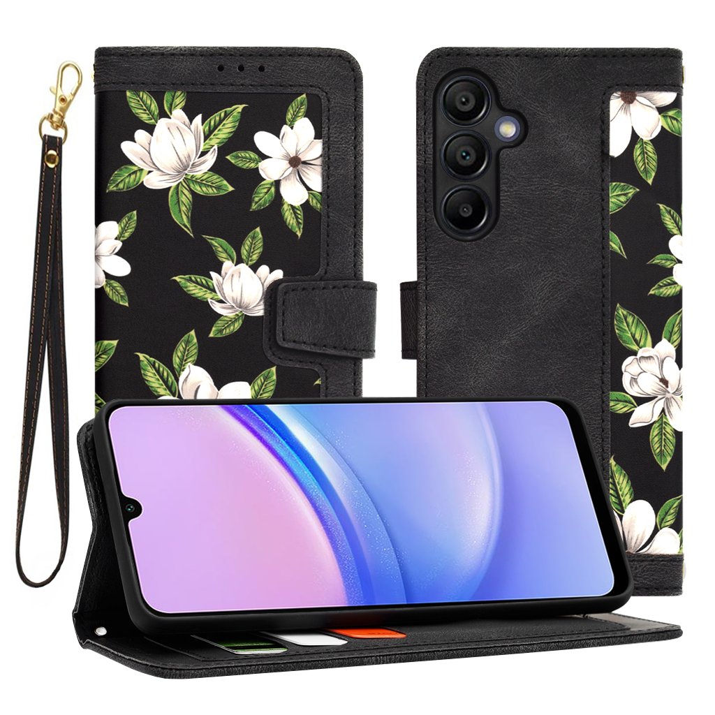 - Puzdro sa pýši čiernym základom, ktorý je zdobený nádherným kvetinovým motívom bielych kvetov s výraznými zelenými listami, pripomínajúcimi magnólie. Tento vzor sa nachádza na vonkajšej strane predného flipu aj na vnútornej strane puzdra, čo dodáva produktu ucelený a luxusný vzhľad.