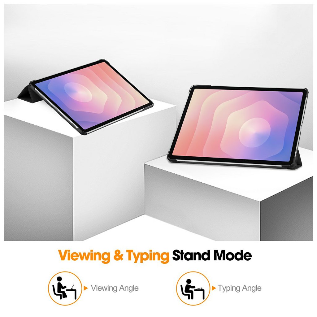 Charakteristickým prvkom je trojdielny skladací predný kryt, ktorý umožňuje jednoduché premenenie puzdra na praktický stojan. Vďaka tomu si môžete tablet nastaviť do dvoch optimálnych polôh – pre pohodlné sledovanie obsahu alebo pre ergonomické písanie. Precízne výrezy zaručujú bezproblémový prístup ku všetkým portom, tlačidlám a fotoaparátu, aniž by ste museli tablet z puzdra vyberať.