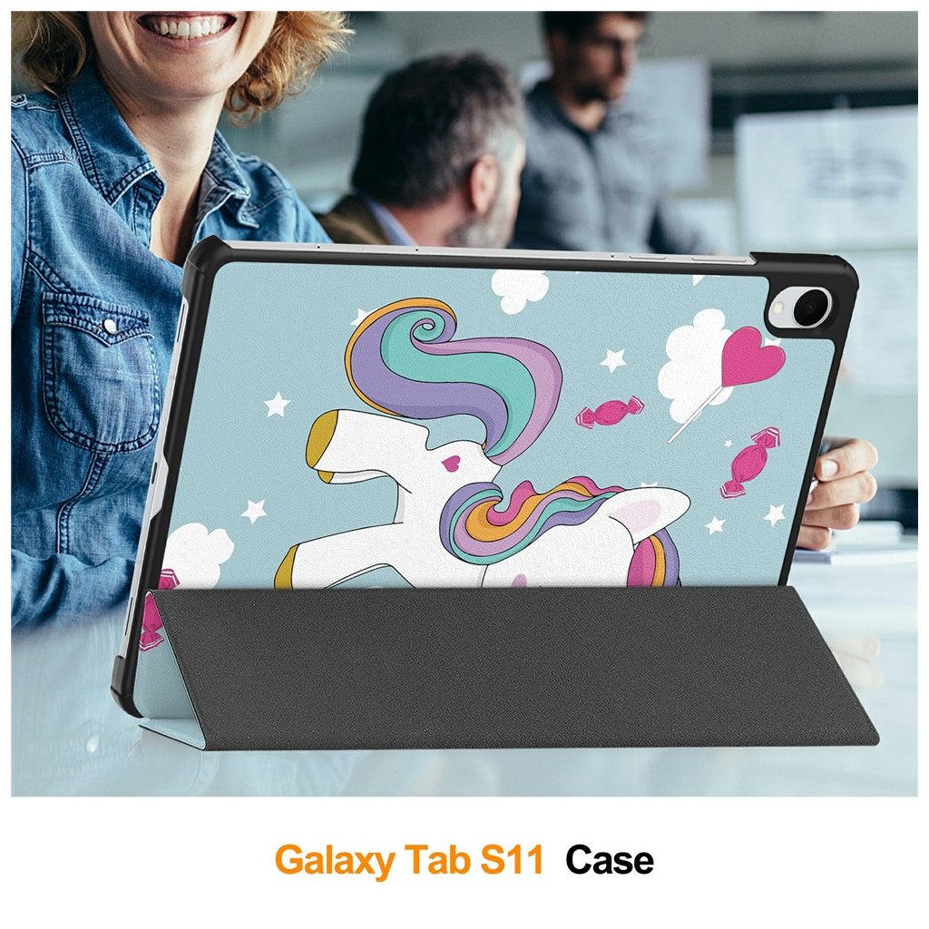 Ochranné puzdro Techsuit FoldPro pre Samsung Galaxy Tab S11 v farbe jednorožec Doprajte svojmu tabletu Samsung Galaxy Tab S11 nielen maximálnu ochranu, ale aj jedinečný štýl s puzdrom Techsuit FoldPro v dizajne jednorožca. Toto puzdro je navrhnuté tak, aby dokonale kombinovalo funkčnosť, odolnosť a hravý vzhľad, ktorý poteší každého používateľa. Dizajn, ktorý okúzli Puzdro Techsuit FoldPro sa pýši okúzľujúcim dizajnom jednorožca na svetlomodrom pozadí. Ilustrácia roztomilého jednorožca s dúhovou hrivou a chvostom, doplnená o obláčky, hviezdičky, srdiečka a cukríky, dodáva vášmu tabletu originálny a veselý vzhľad. Vďaka svojmu štíhlemu profilu a precíznemu spracovaniu puzdro skvele padne do ruky a zároveň zachováva elegantné línie vášho zariadenia. Kľúčové vlastnosti a parametre- Komplexná ochrana: Puzdro je vyrobené z kvalitných a odolných materiálov, ktoré efektívne chránia váš tablet pred poškriabaním, nárazmi a prachom.