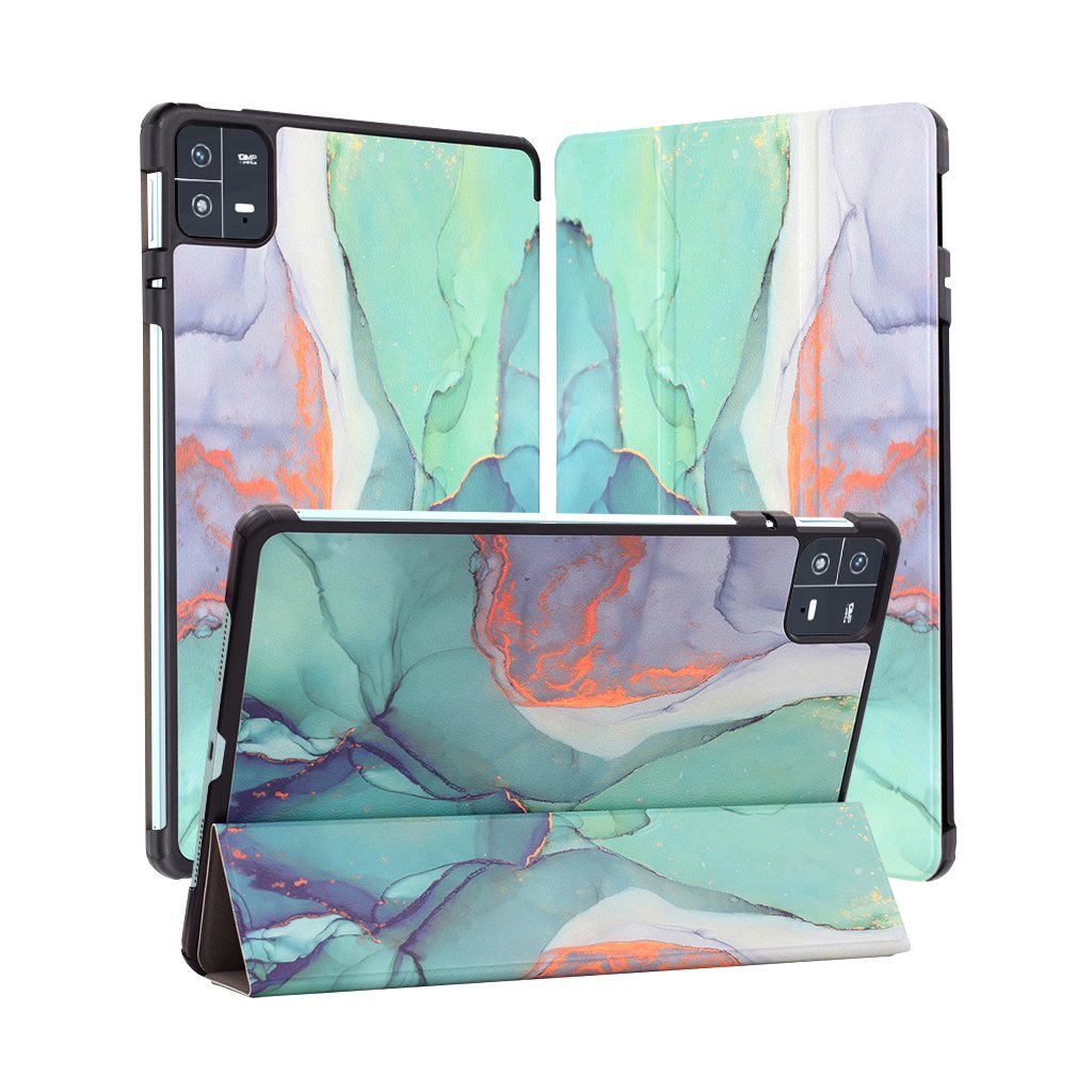 Puzdro Techsuit FoldPro sa pýši sofistikovaným folio dizajnom, ktorý poskytuje komplexnú 360° ochranu pre váš tablet.- Vizuálna lahôdka: Vonkajšia strana je zdobená originálnym vzorom „Green Time“, ktorý pripomína abstraktný mramor alebo akvarelovú maľbu. Dominujú mu harmonické odtiene zelenej, modrej a fialovej, doplnené o jemné oranžové a zlaté akcenty, ktoré dodávajú puzdru luxusný a umelecký vzhľad.