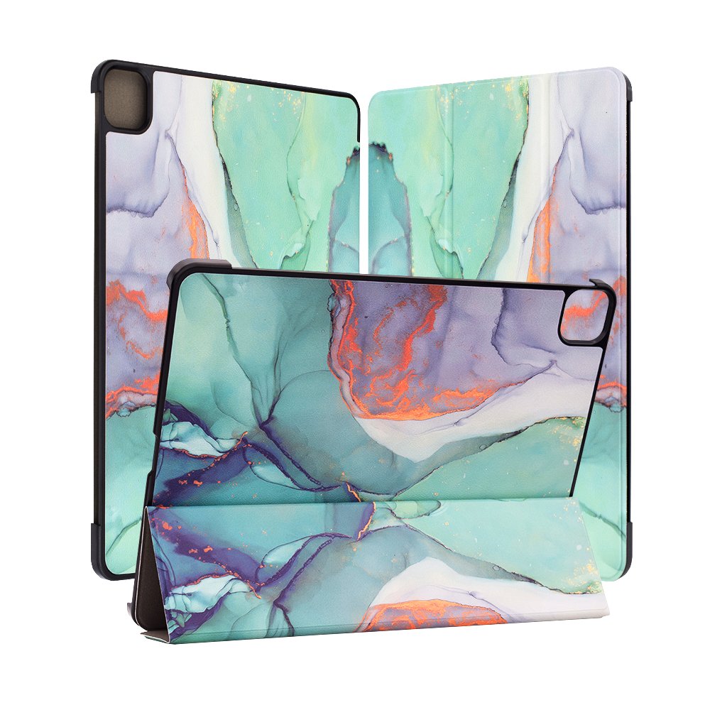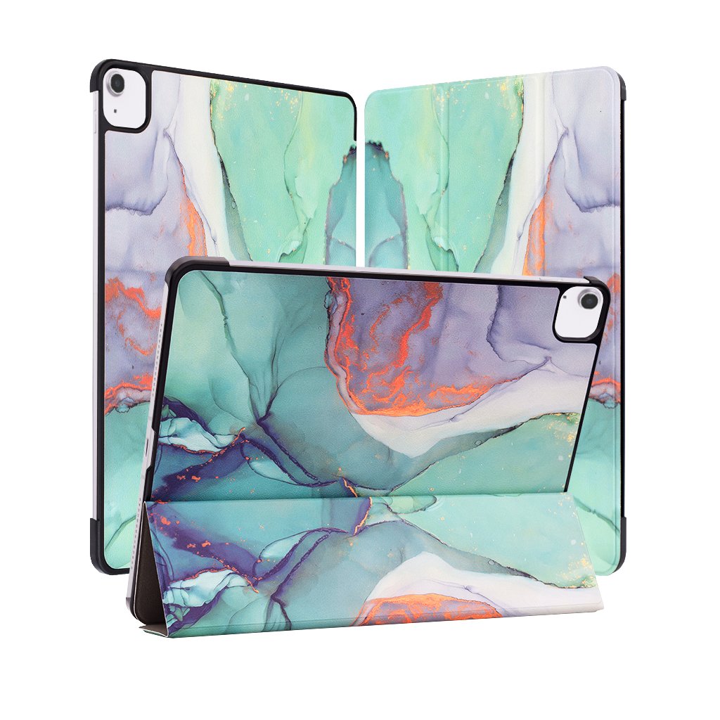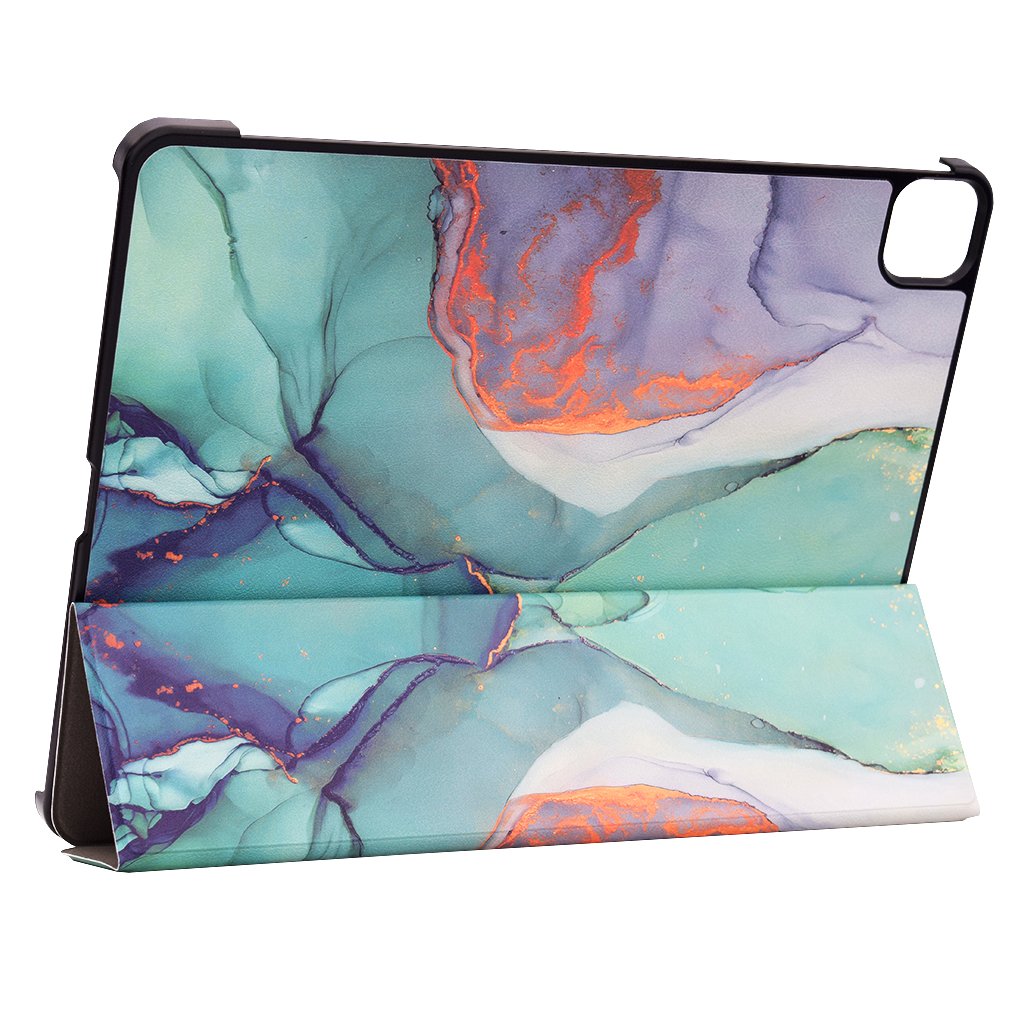 Puzdro Techsuit FoldPro sa pýši úchvatným dizajnom "Green Time", ktorý pripomína abstraktnú maľbu s fluidnými prechodmi zelených, tyrkysových a fialových odtieňov, doplnených o jemné zlatisté akcenty. Tento jedinečný vzor dodáva puzdru moderný a luxusný vzhľad. Vonkajšia strana je vyrobená z odolného syntetického materiálu, ktorý je príjemný na dotyk a zároveň odoláva opotrebovaniu. Vnútorná strana puzdra je opatrená mäkkou podšívkou, ktorá chráni displej vášho iPadu pred poškriabaním a nečistotami.