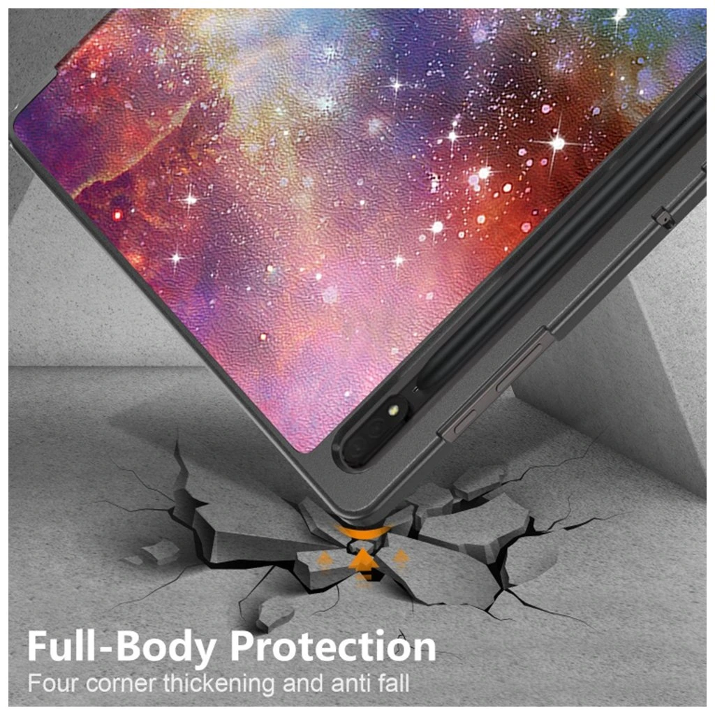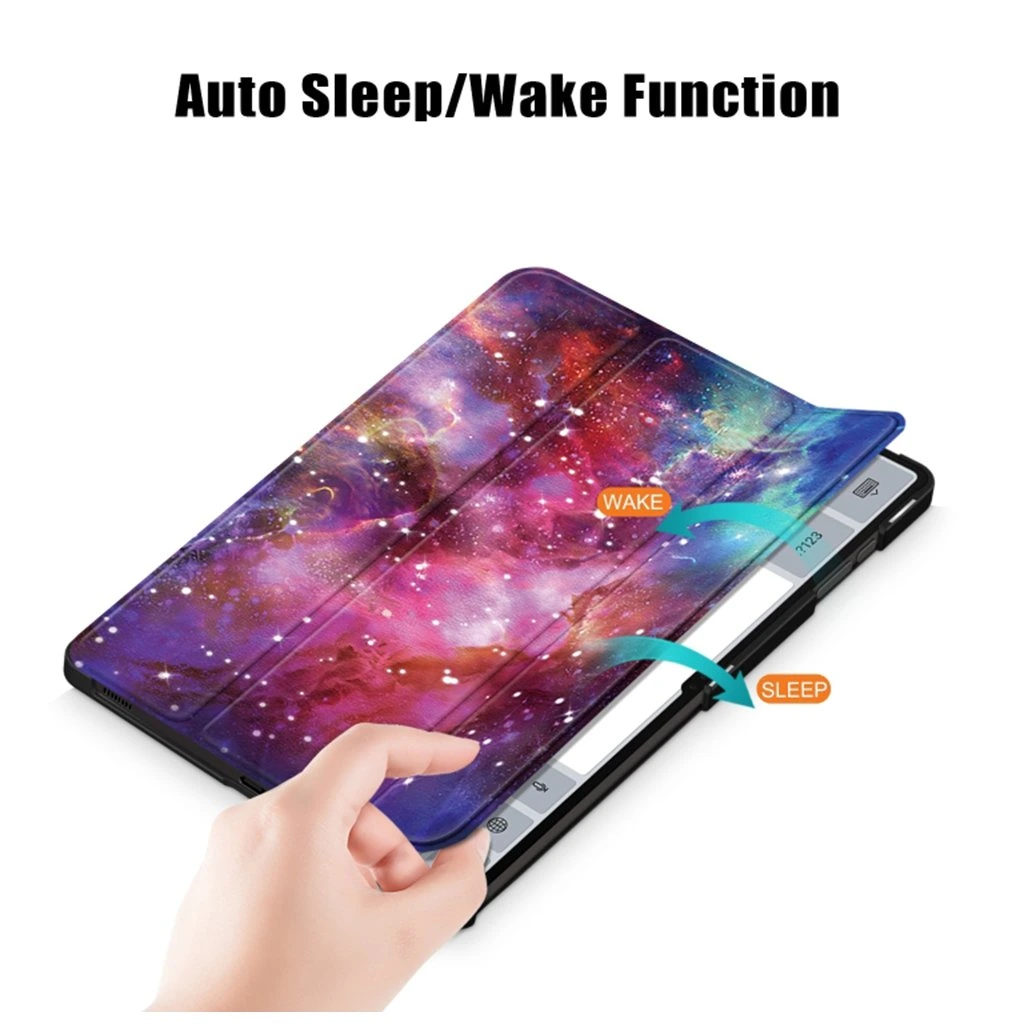 **Techsuit FoldPro puzdro pre Samsung Galaxy Tab** Predstavujeme **Techsuit FoldPro**, elegantné a vysoko funkčné puzdro navrhnuté pre maximálnu ochranu a pohodlie vášho tabletu. Toto puzdro kombinuje moderný dizajn s praktickými prvkami, ktoré oceníte pri každodennom používaní. **Dizajn a materiály** Puzdro Techsuit FoldPro sa pýši unikátnym dizajnom s motívom galaxie či hmloviny, ktorý dodá vášmu tabletu osobitý a pútavý vzhľad. Predná strana je skladacia (tri-fold), čo umožňuje nastavenie tabletu do rôznych uhlov pre pohodlné sledovanie obsahu alebo písanie. Zadná časť puzdra je vyhotovená v elegantnej tmavej farbe, ktorá dopĺňa celkový estetický dojem. Puzdro je vyrobené z kvalitných materiálov, ktoré zaisťujú príjemný pocit na dotyk a dlhú životnosť. **Kľúčové vlastnosti a ochrana**- **Komplexná ochrana:** Puzdro poskytuje ochranu celého tela tabletu, vrátane zosilnených rohov, ktoré efektívne absorbujú nárazy a chránia zariadenie pred pádmi.