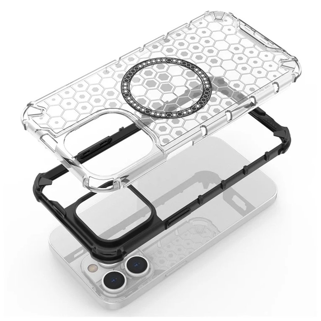 Kryt Techsuit HoneyComb Shield MagSafe sa pýši priehľadným dizajnom s unikátnym voštinovým (honeycomb) vzorom na zadnej strane, ktorý dodáva moderný a sofistikovaný vzhľad. Zesílené rohy a okraje v kontrastnej čiernej farbe zaisťujú maximálnu ochranu proti pádům a nárazom, zatiaľ čo precízne výrezy zaručujú jednoduchý prístup ku všetkým portom, tlačidlám a fotoaparátu.